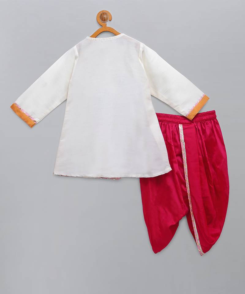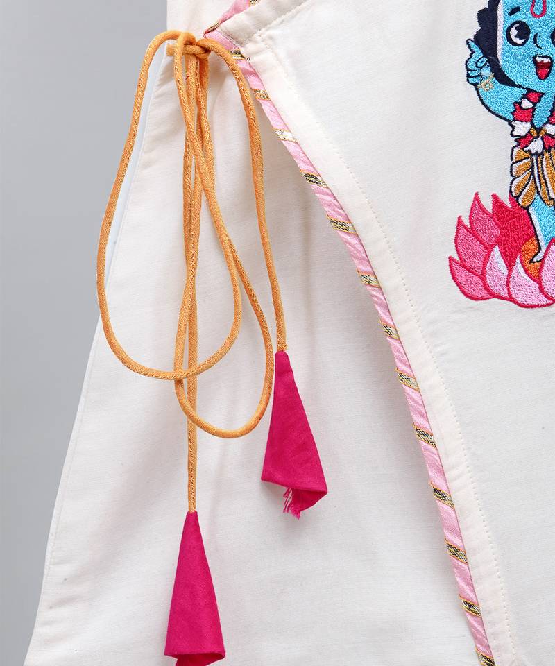 | Product Description | Off White Angrakha Kurta With Krishna Embroidery . Kurta With Lace Finishings.The Set Comes With A Fabric Khadi Printed Mukut . Fuschia Pink Dhoti With Pleating And Contrast Lace Finishings. Bottom With Elasticated Waist