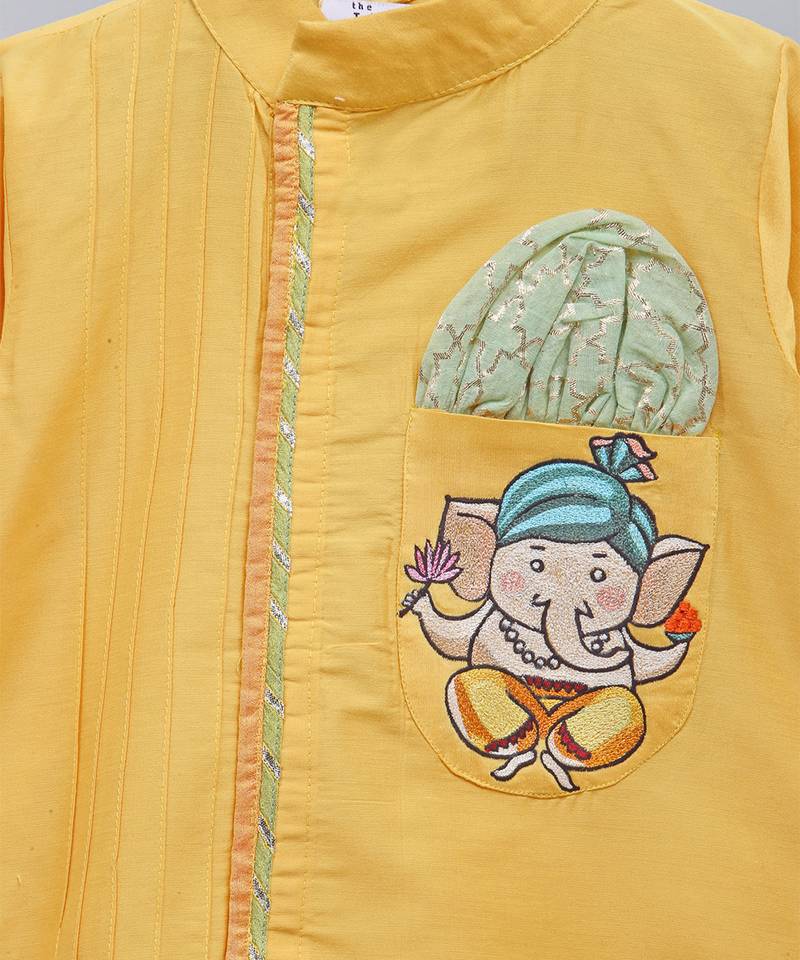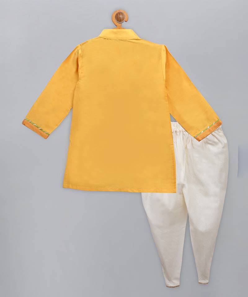 | Product Description | Mustard Kurta Cotton Silk Kurta With Ganpati Embroidered Pocket . Kurta With Contrast Pocket Square . Kurta With Lace Finishings. Off White Dhoti With An Overlap Look And Gota Finishings. Bottom With Elasticated Waist