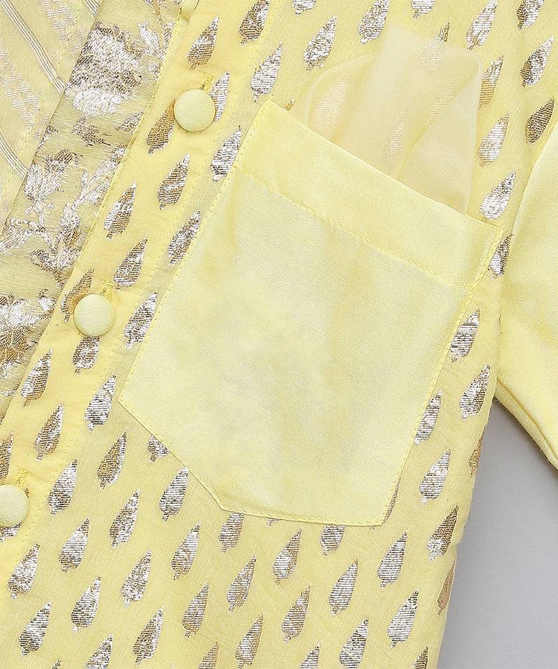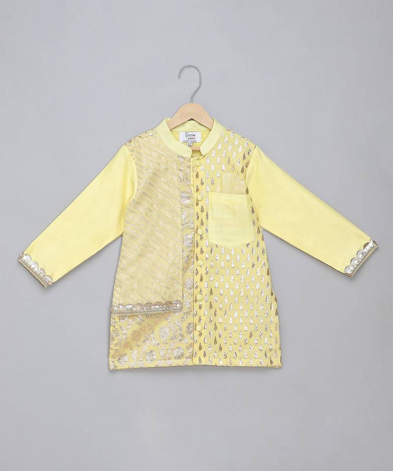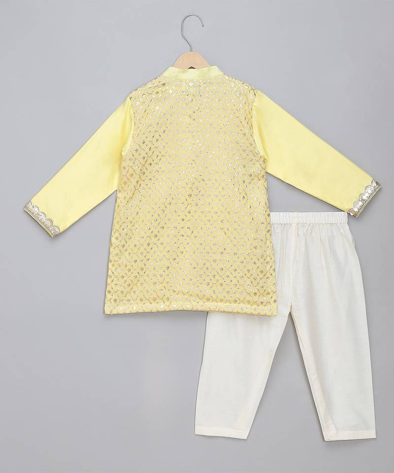 | Product Description | Lime Yellow Multi Zari Panelled Kurta With Cotton Lining.Kurta With Front Opening.. Pocket With Pocket Square. Organza Panel With Gota Embellishments. Lace Finishings Pajama With Elastic.