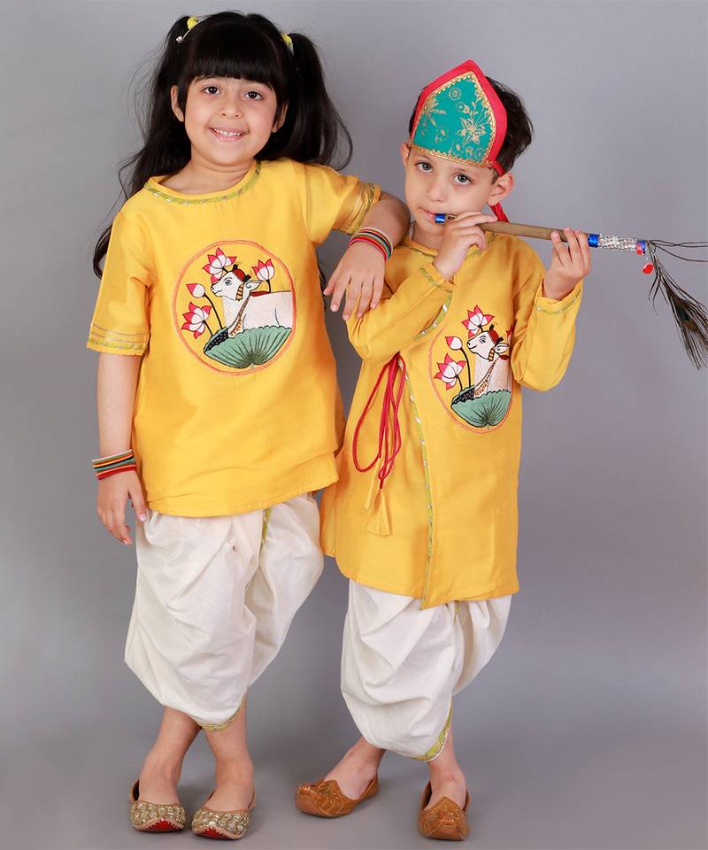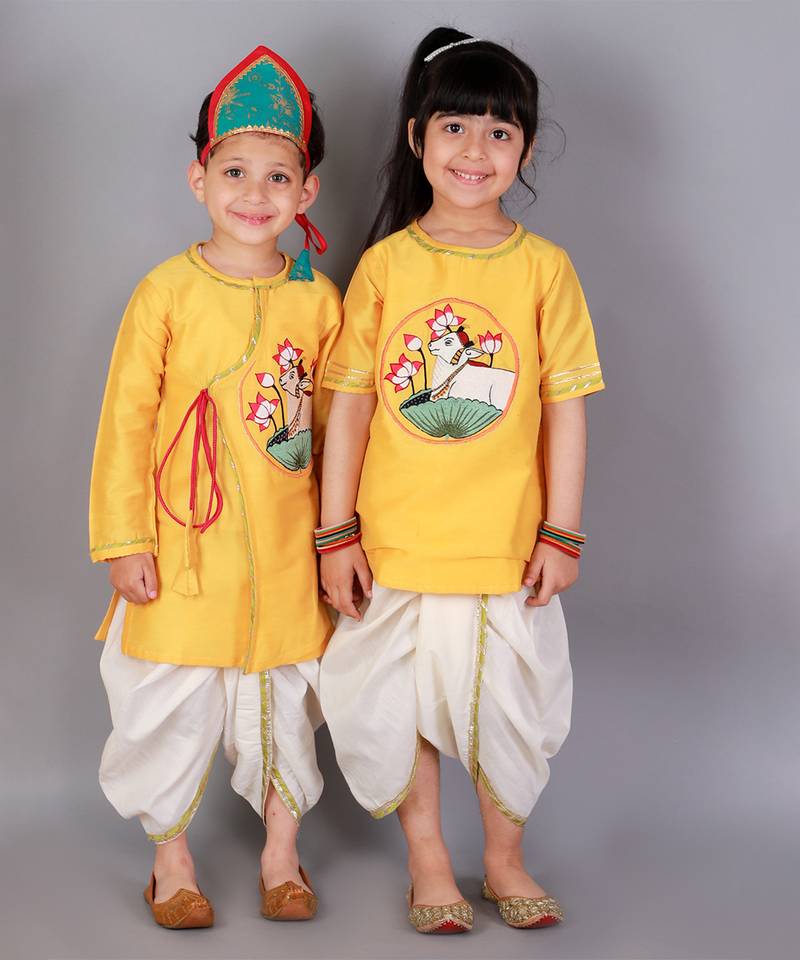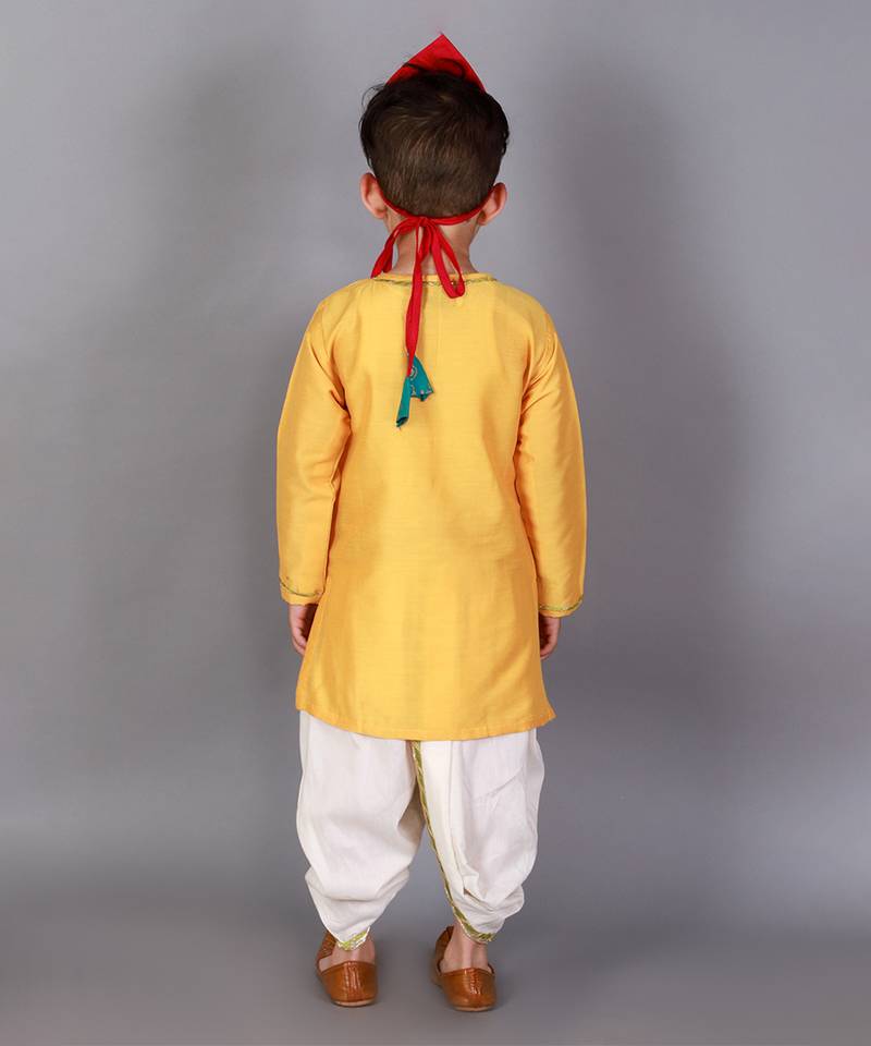 | Product Description | Mustard Angrakha Kurta With Pichwai Embroidery . Kurta With Lace Finishings.The Set Comes With A Fabric Khadi Printed Mukut . Off White Dhoti With Pleating And Contrast Lace Finishings. Bottom With Elasticated Waist