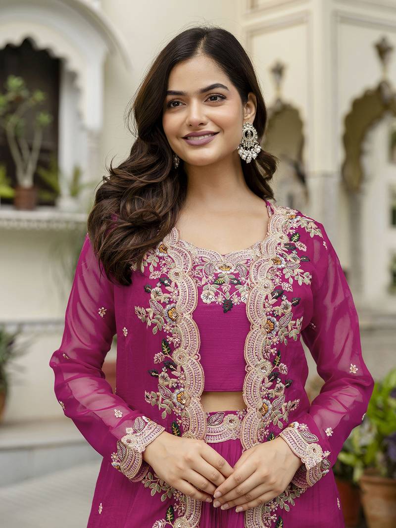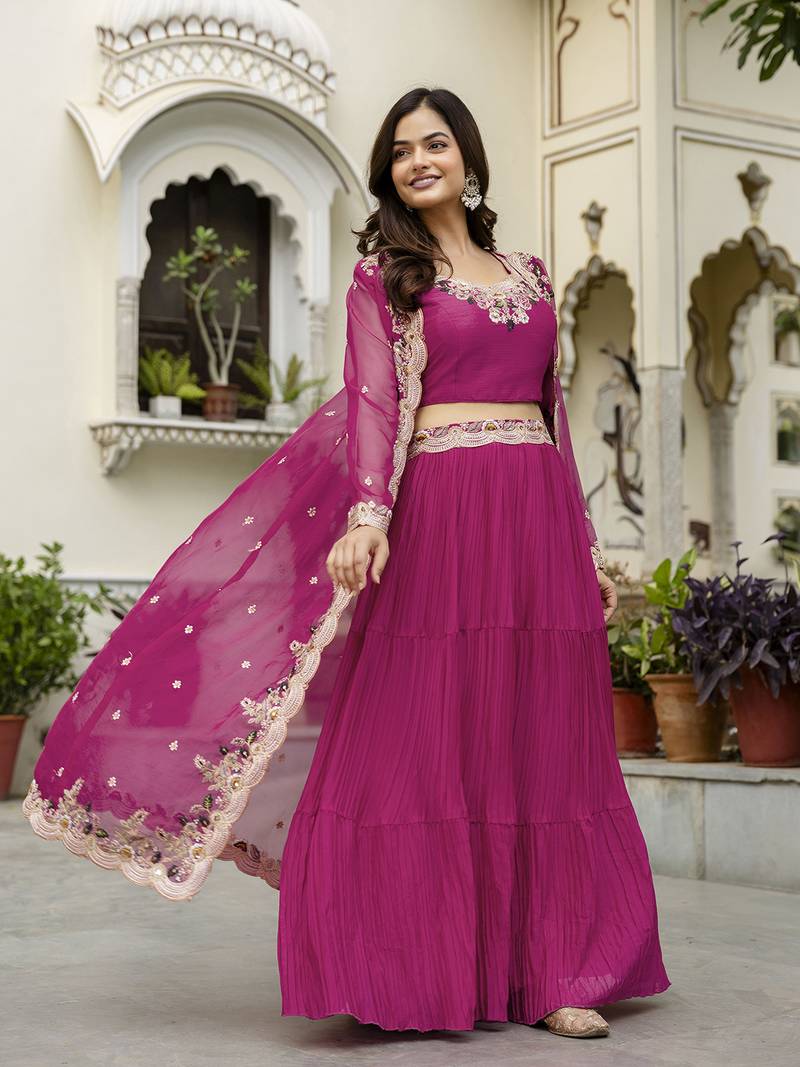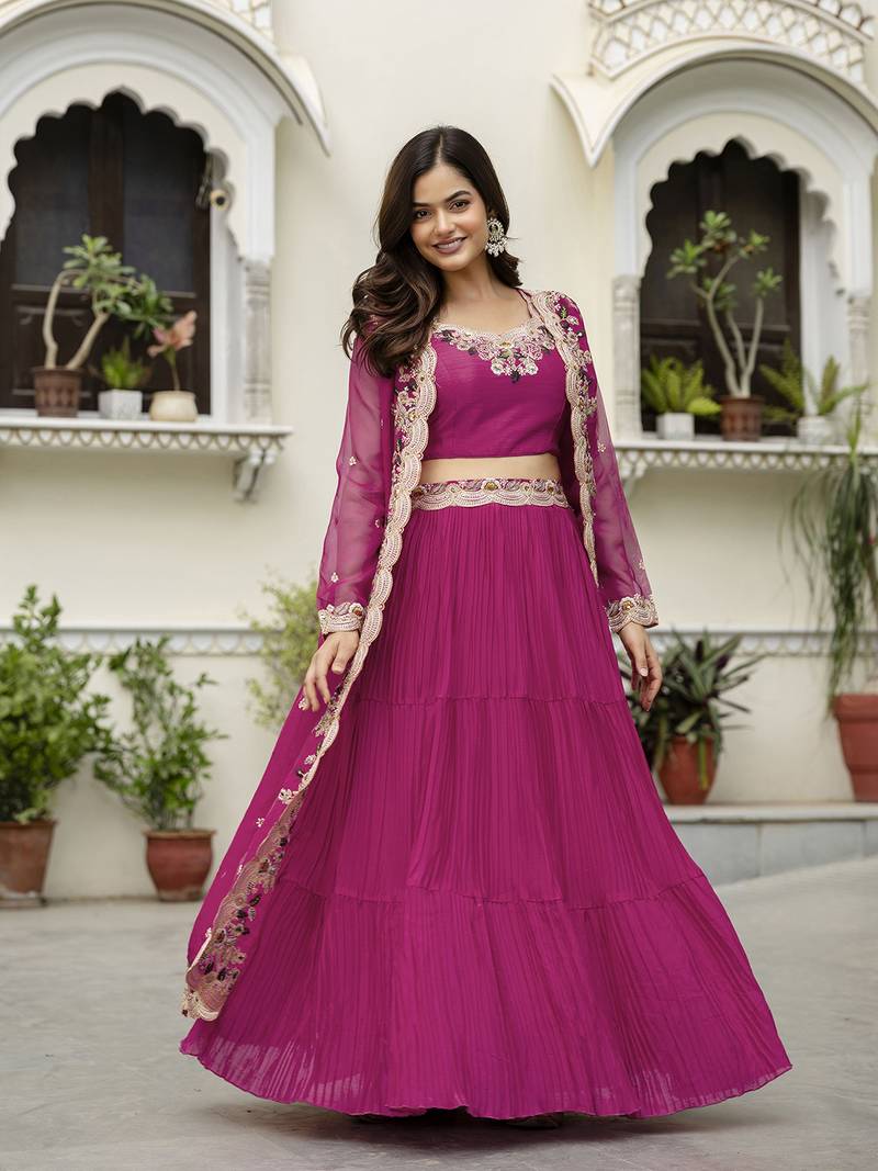 Soft organza embroidery crop top with flared pleated skirt and shrug set stitched