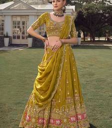 | Product Description | The Lehenga Is Crafted In A Rich Mustard Olive Tissue Fabric That Gives A Soft Sheen And Graceful Flow. It Is Beautifully Adorned With Sequins, Khatli Work, Beadwork, And Intricate Thread Embroidery, Highlighted With Traditional Motifs And A Heavily Embellished Border.