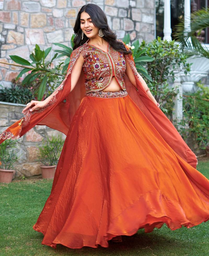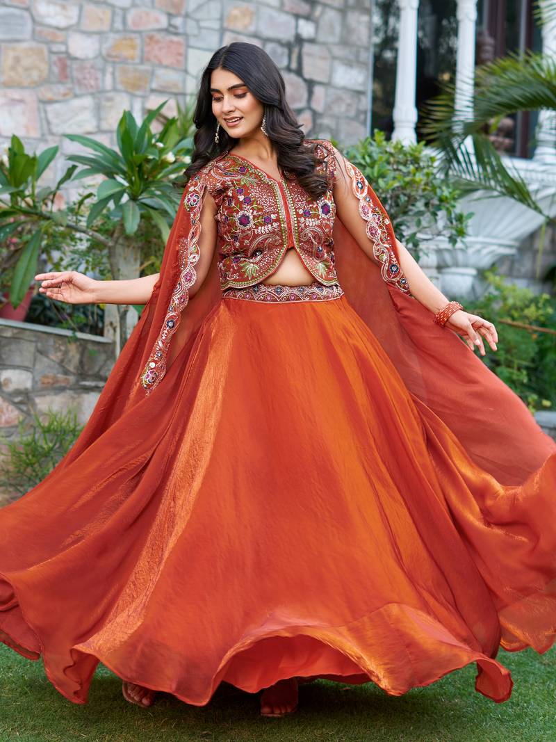 Orange heavy embroidered silk festive lehenga set choli with dupatta