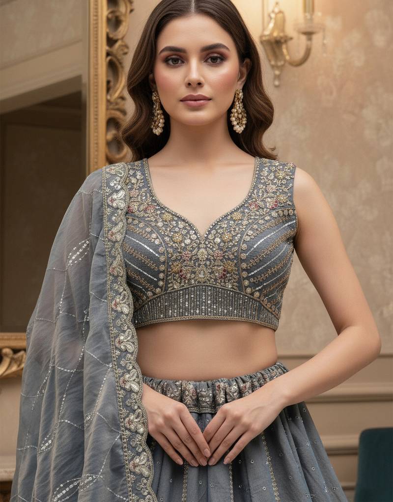 | Product Description | The Lehenga Comes In A Beautiful Grey Shade With Rich Peacock Embroidery And Sparkling Sequin Highlights. Its Detailed Thread Work And Zircon Diamond Touches Give It A Royal Festive Look.