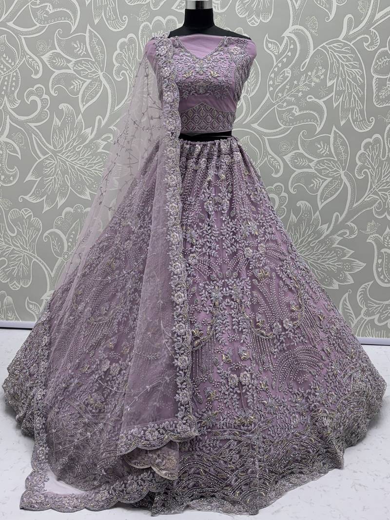 | Product Description | This Luxurious Lilac Lehenga Is Crafted In Premium Net Fabric And Adorned With Exquisite Pearl Beads, Zari And Dori Embroidery. The Shimmering Zircon Diamond Embellishments Enhance Its Royal Elegance, Making It A Breathtaking Bridal Statement.