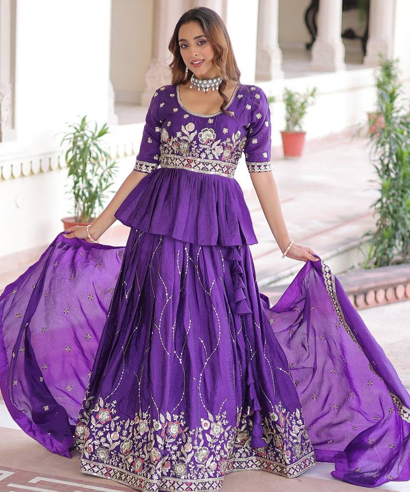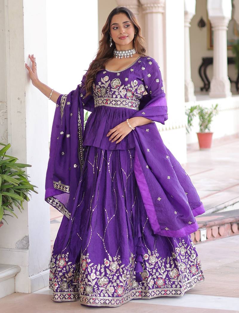 Purple Sequins Organza Festive Lehenga With Peplum Top