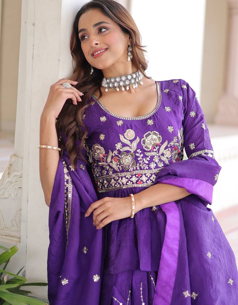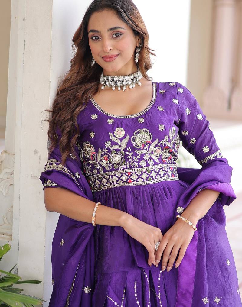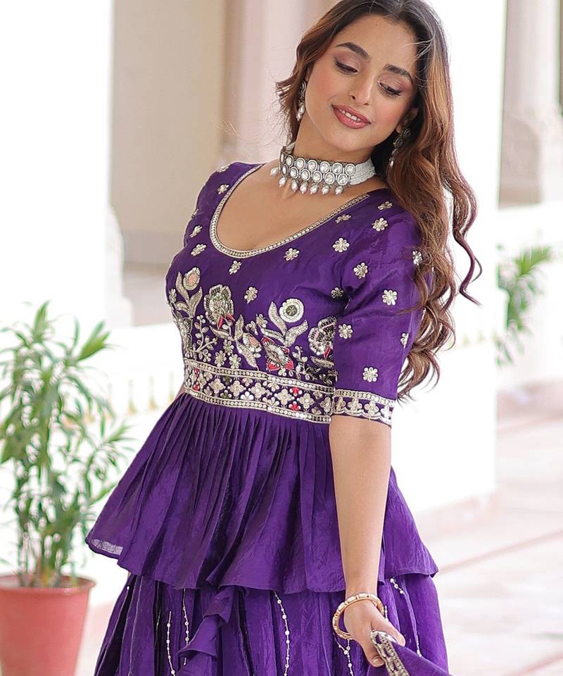 Perfect For Grand Celebrations, Weddings, Sangeet Nights And Festive Occasions Where You Want To Look Traditionally Elegant. This Purple Embellished Set Promises A Royal Statement Look With Unmatched Grace And Charm.