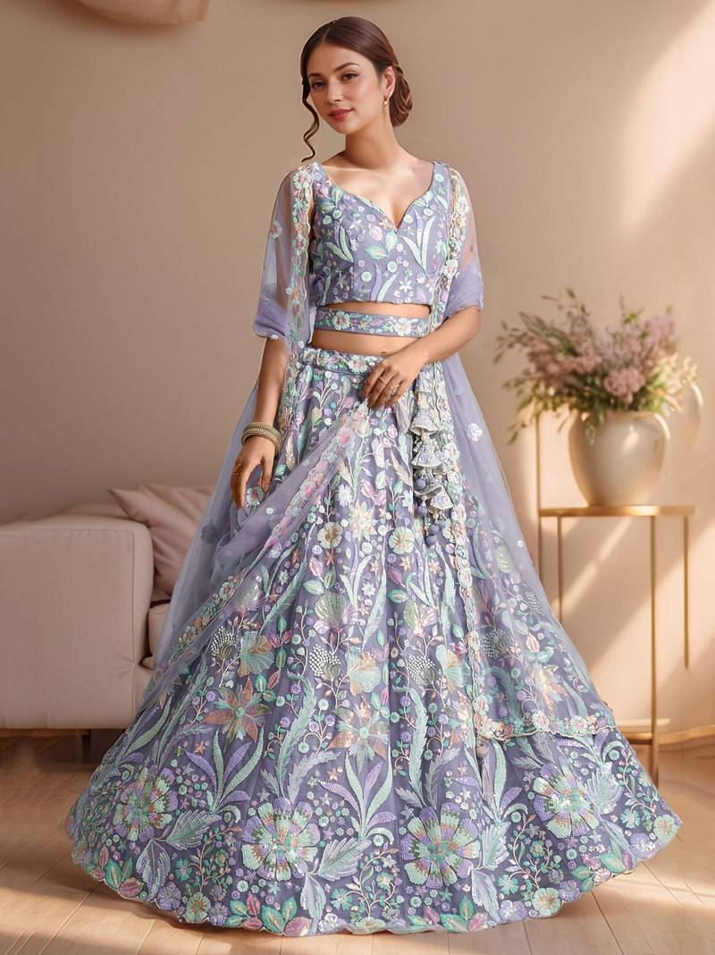 | Product Description | This Dreamy Lavender Lehenga Set Radiates Elegance And Romance With Its Soft Pastel Tones And Floral Embroidery. The Semi Stitched Soft Net Lehenga Features Intricate Multicolor Thread And Sequin Work That Adds A Graceful Shimmer. Its 3.50 Meter Flair Gives A Voluminous And Regal Flow, Ideal For Festive And Wedding Celebrations.&Nbsp;