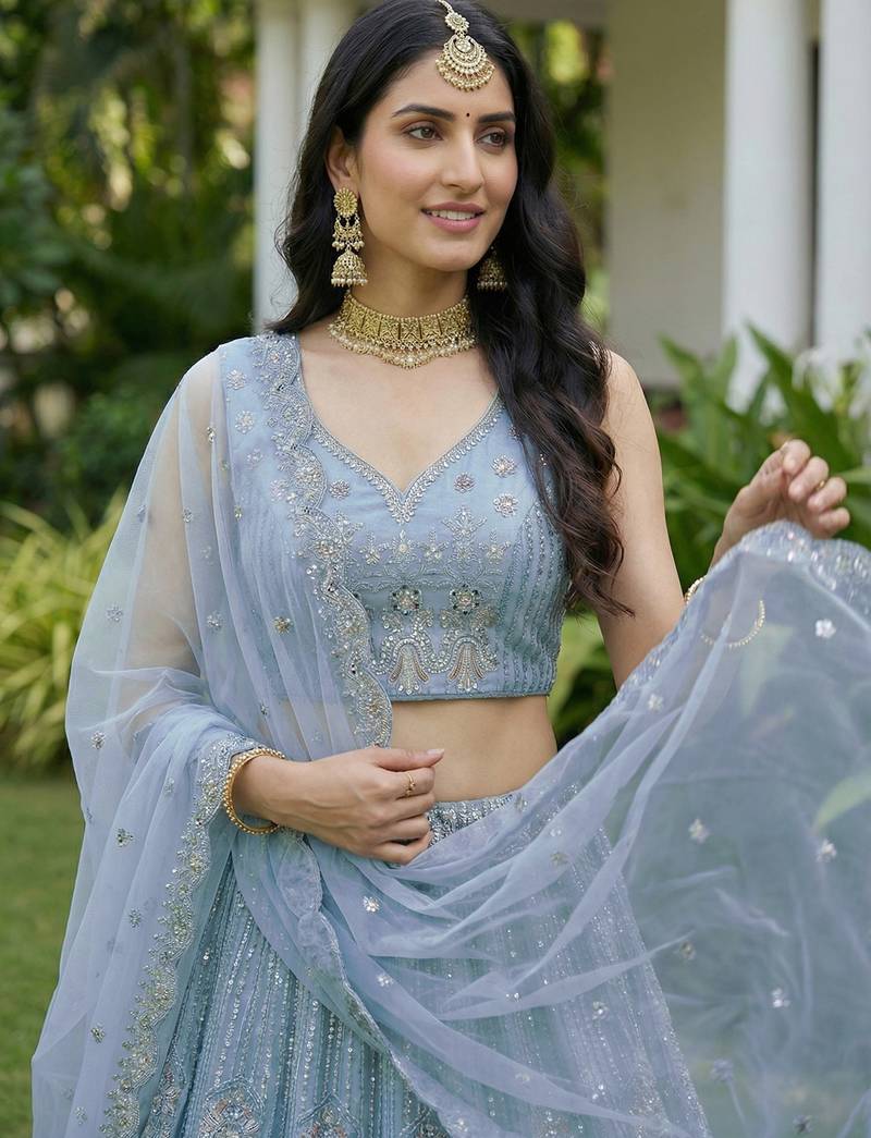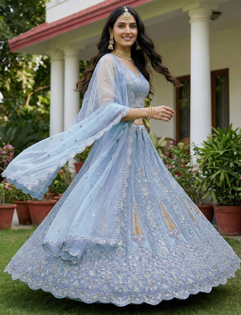 | Product Description | This Lehenga Choli Features A Graceful Pastel Sky Blue Tone Crafted In Delicate Net Fabric, Giving It A Soft And Elegant Appeal. The Lehenga Is Beautifully Adorned With Dori Embroidered Motifs, Zari And Thread Work, Along With Sequins And Zircon Diamond Embellishments That Add A Subtle Festive Shimmer.