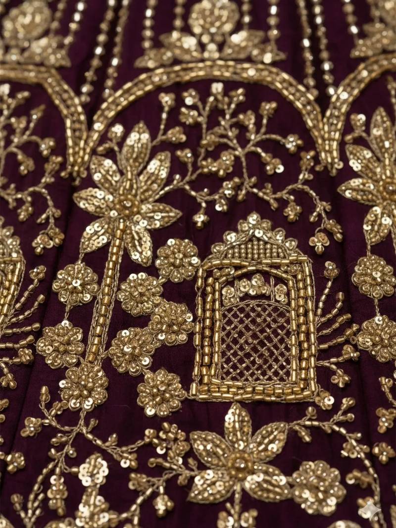 | Product Description | This Exquisite Wine Lehenga Is Designed In Rich Net Fabric, Showcasing Detailed Golden Embroidery And Sequins That Exude Timeless Elegance. The Semi Stitched Structure Allows Easy Customization, While The Heavy Flare Adds A Majestic Touch, Perfect For Grand Festive Or Bridal Occasions.