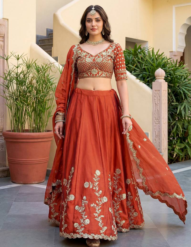 | Product Description | The Stitched Lehenga Is Crafted In A Rich Dark Orange Shade Using Luxurious Rangoli Silk, Giving It A Royal And Graceful Appeal. It Is Beautifully Enhanced With Intricate Sequins And Thread Embroidery Work Spread Elegantly Across The Skirt, Finished With A Refined Embroidered Hemline.
