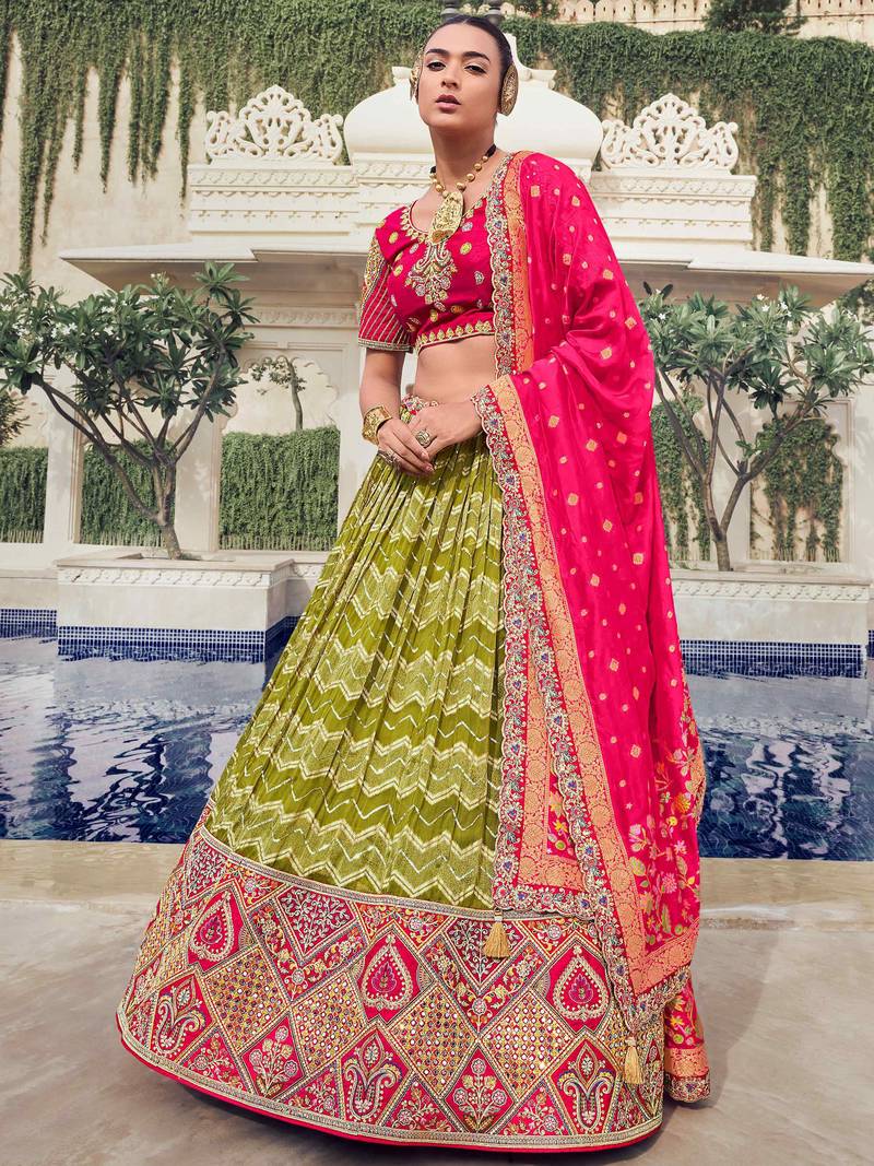 | Product Description | The Lehenga Features A Refreshing Olive Green Base Crafted In Rich Organza Fabric, Highlighted With A Vibrant Pink Patchwork Border. It Is Beautifully Adorned With Sequins, Zari, Detailed Thread Embroidery, And Mirror Work That Adds Festive Sparkle And Texture.
