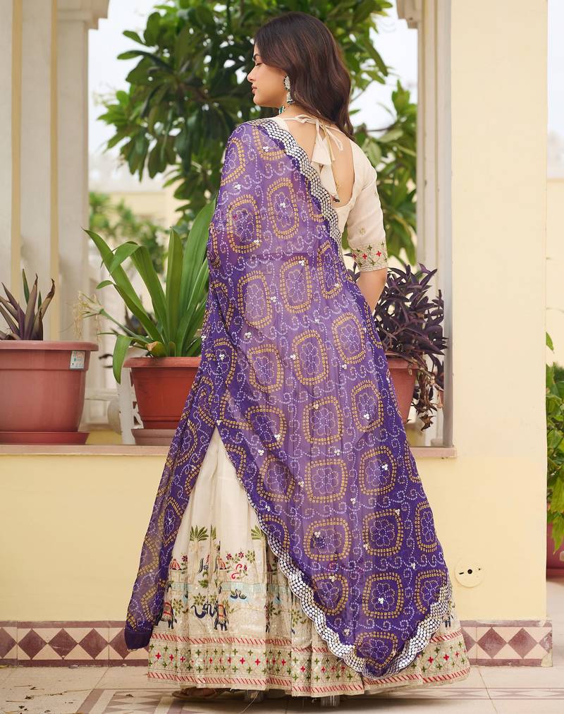 Off white sequnis silk lehenga set choli with dupatta with purple dupatta