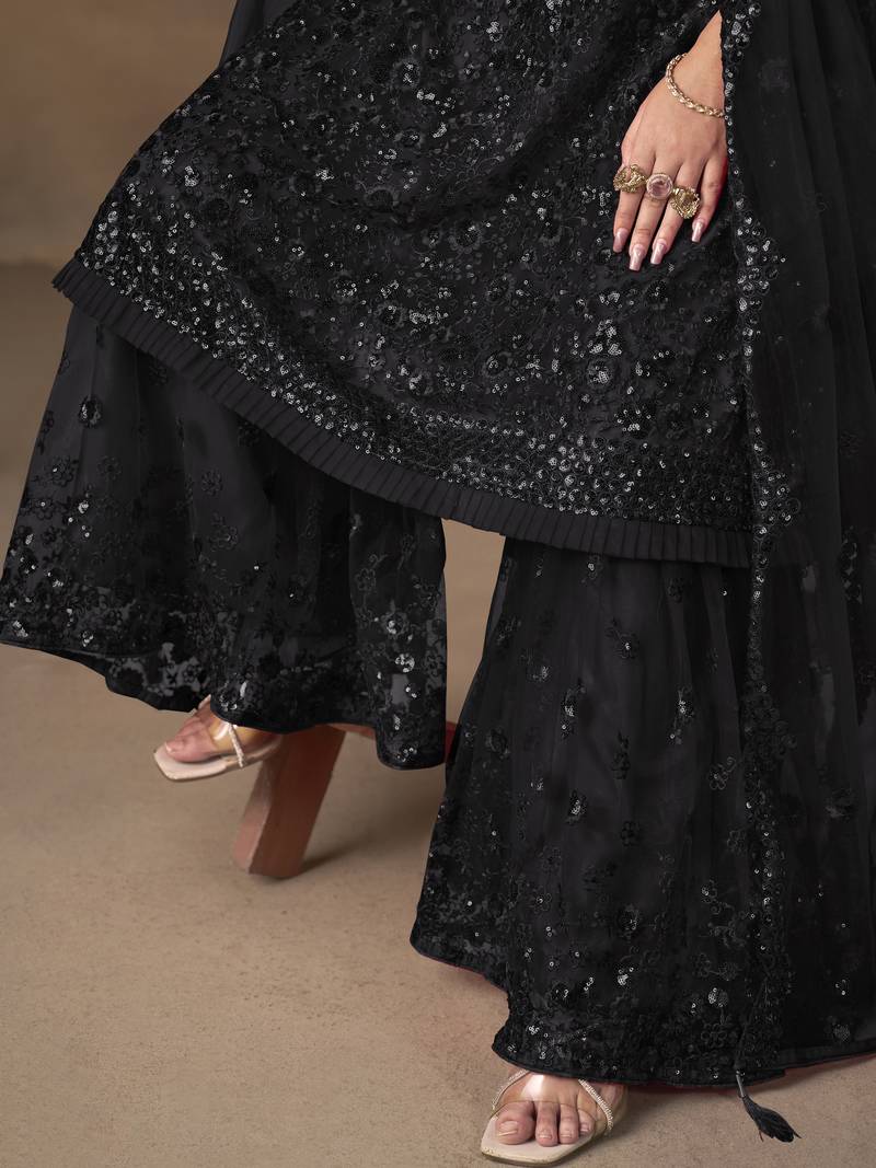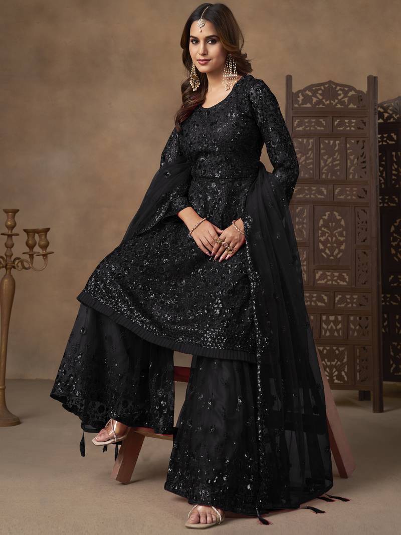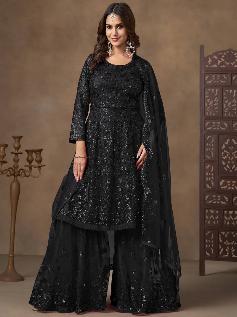 | Product Description | This Sharara Suit Features A Rich Black Net Kurta Beautifully Adorned With Intricate Sequins And Thread Embroidery Work. The Detailed Floral And Textured Embroidery Adds Depth And Shimmer, Giving The Kurta A Luxurious And Elegant Appearance.