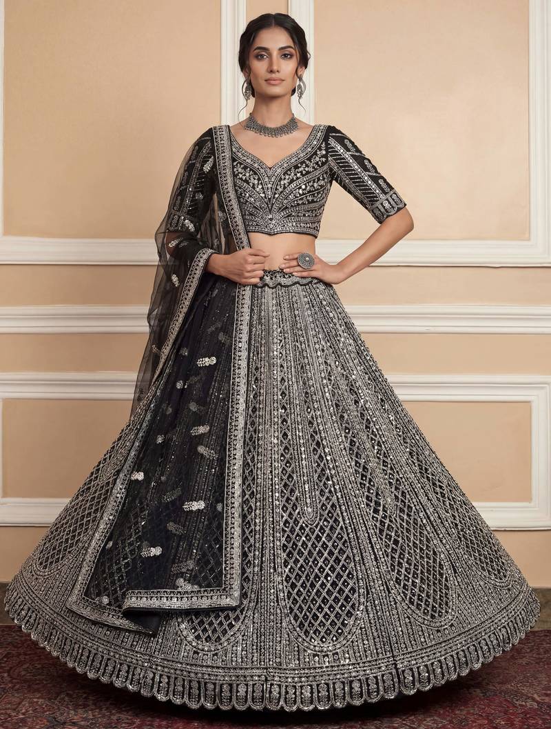 | Product Description | This Stunning Lehenga Is Crafted In A Rich Black Shade Using Heavy Net Fabric, Giving It A Luxurious And Regal Appeal. It Is Beautifully Adorned With All Over Sequin Work, Butterfly Motifs, Multi Thread Embroidery, And Zircon Diamond Studding For An Elegant Sparkle.