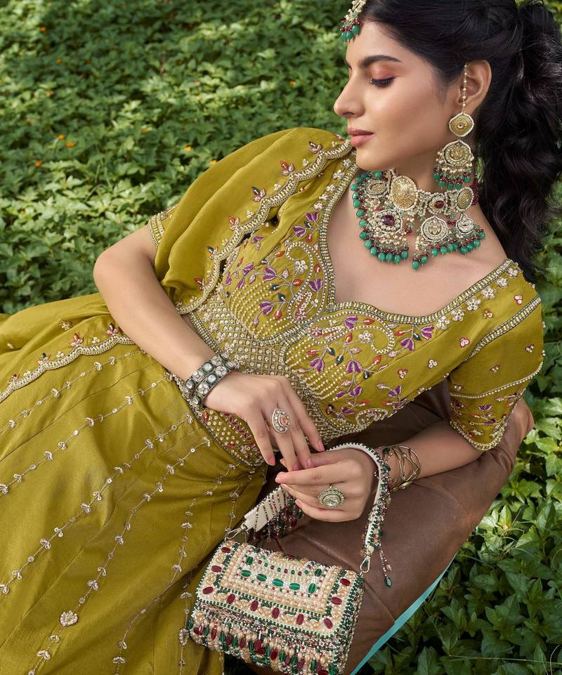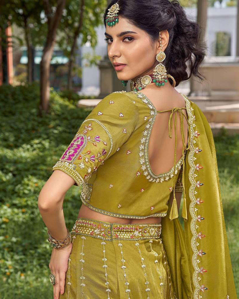 | Product Description | The Lehenga Features A Rich Olive Green Tone Crafted In Luxurious Tissue Fabric, Giving It A Soft Sheen And Graceful Fall. It Is Beautifully Adorned With Intricate Sequins, Zari, Thread Embroidery, And Delicate Beadwork, Highlighted With Detailed Motifs Along The Hem For A Regal Finish.