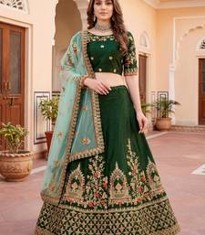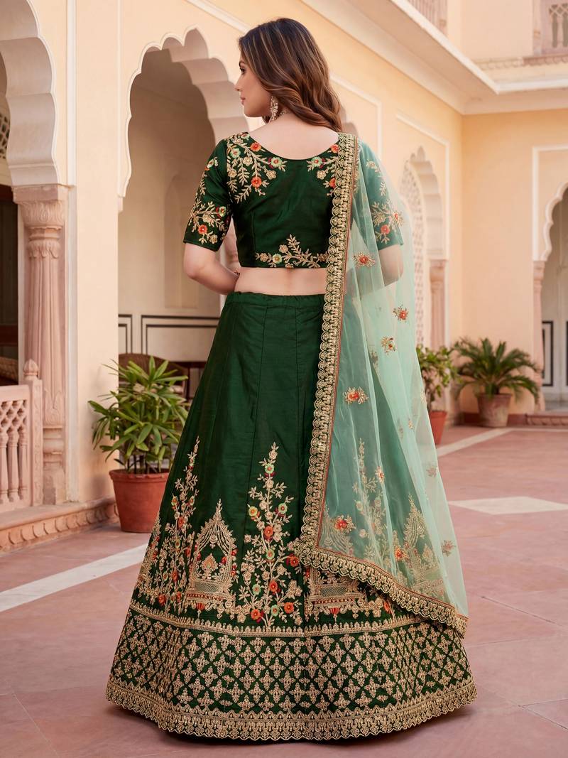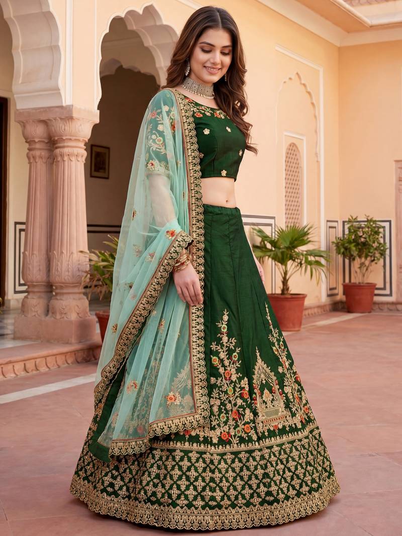 | Product Description | This Elegant Lehenga Set Features A Rich, Deep Green Tone Crafted In Premium Tafeta Satin Silk, Giving It A Royal And Graceful Appeal. The Lehenga And Blouse Are Beautifully Adorned With Intricate Thread, Dori, And Zari Embroidery, Highlighted With Delicate Diamond Work, Creating A Luxurious Festive Finish.