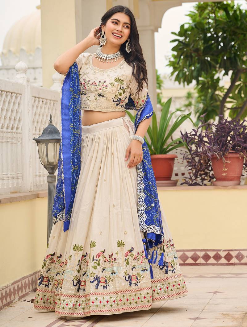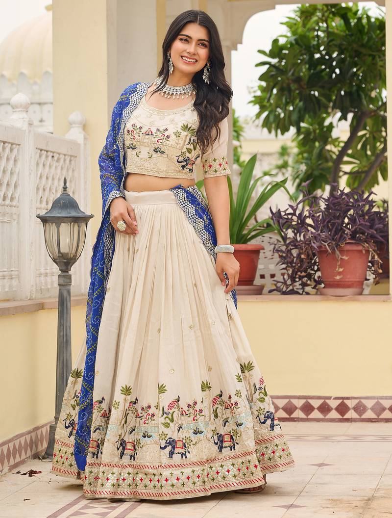 | Product Description | The Lehenga Is Crafted From Pure Tissue Silk In An Elegant Cream Shade, Richly Enhanced With Heavy Embroidery, Sequence &Amp; Thread Work. The Border Showcases Vibrant Motifs Of Elephants, Peacocks, And Florals, Giving It A Regal, Festive Appeal.
