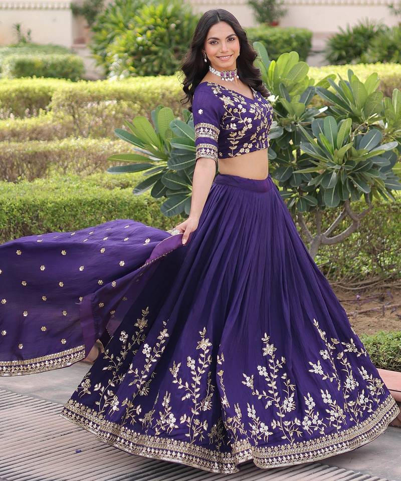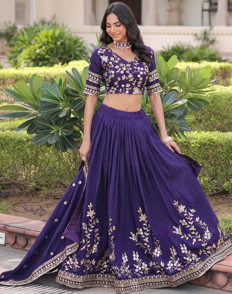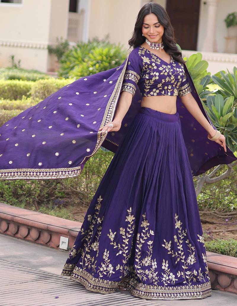 | Product Description | This Elegant Lehenga Comes In A Rich Royal Purple Shade, Crafted From Nc Vichitra Silk That Gives A Graceful Flow And Premium Sheen. It Is Beautifully Adorned With Heavy Sequins And Zari Embroidered Floral Work Along The Hem And Panels, Creating A Festive And Luxurious Appeal.