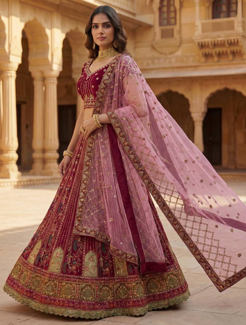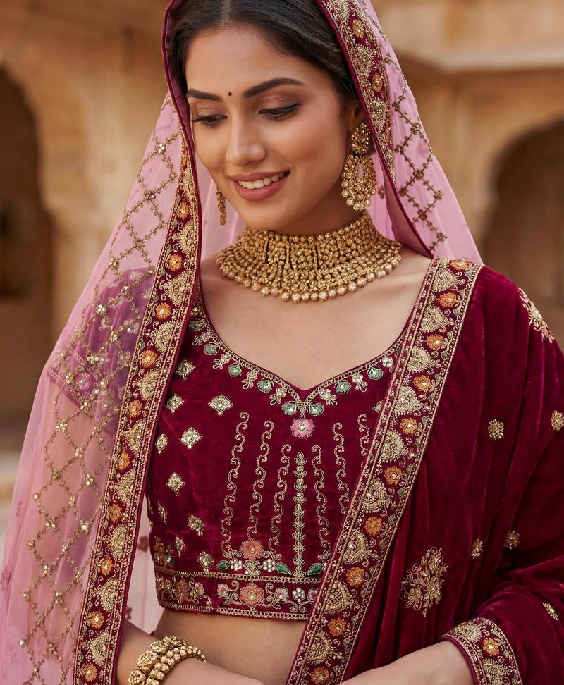 | Product Name | Maroon Embroidered Velvet Bridal Lehenga Set Choli With Dupatta With Double Dupatta | |
