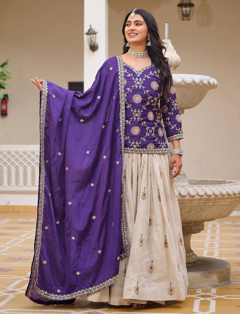 The Top Comes In A Rich Purple Color With Heavy Embroidery, Cording, Sequins, And Thread Work. Its Pure Chinon Fabric And Beautiful Motifs Give A Bright, Festive, And Elegant Look.