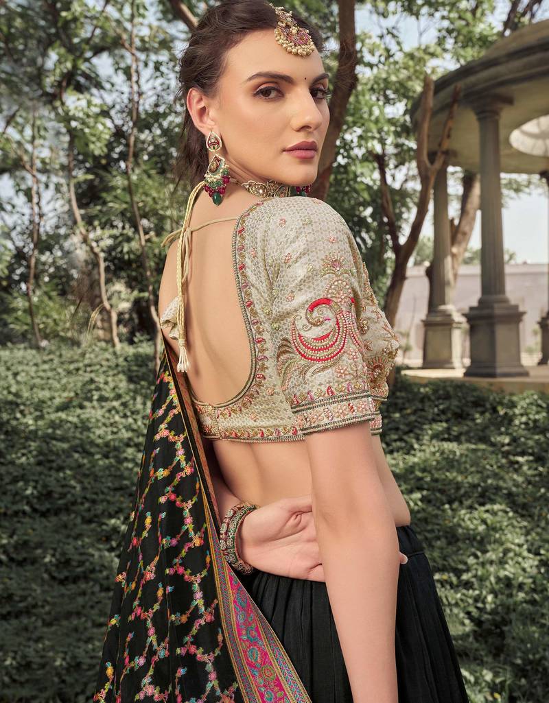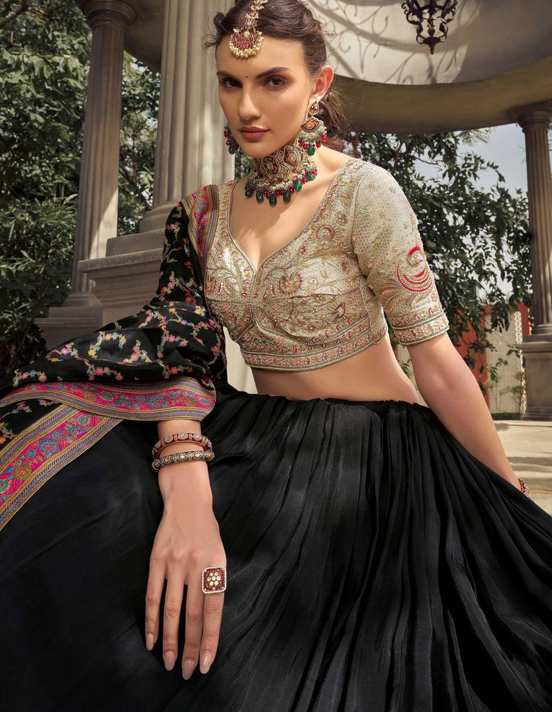 Black embroidered silk festive lehenga set choli with dupatta