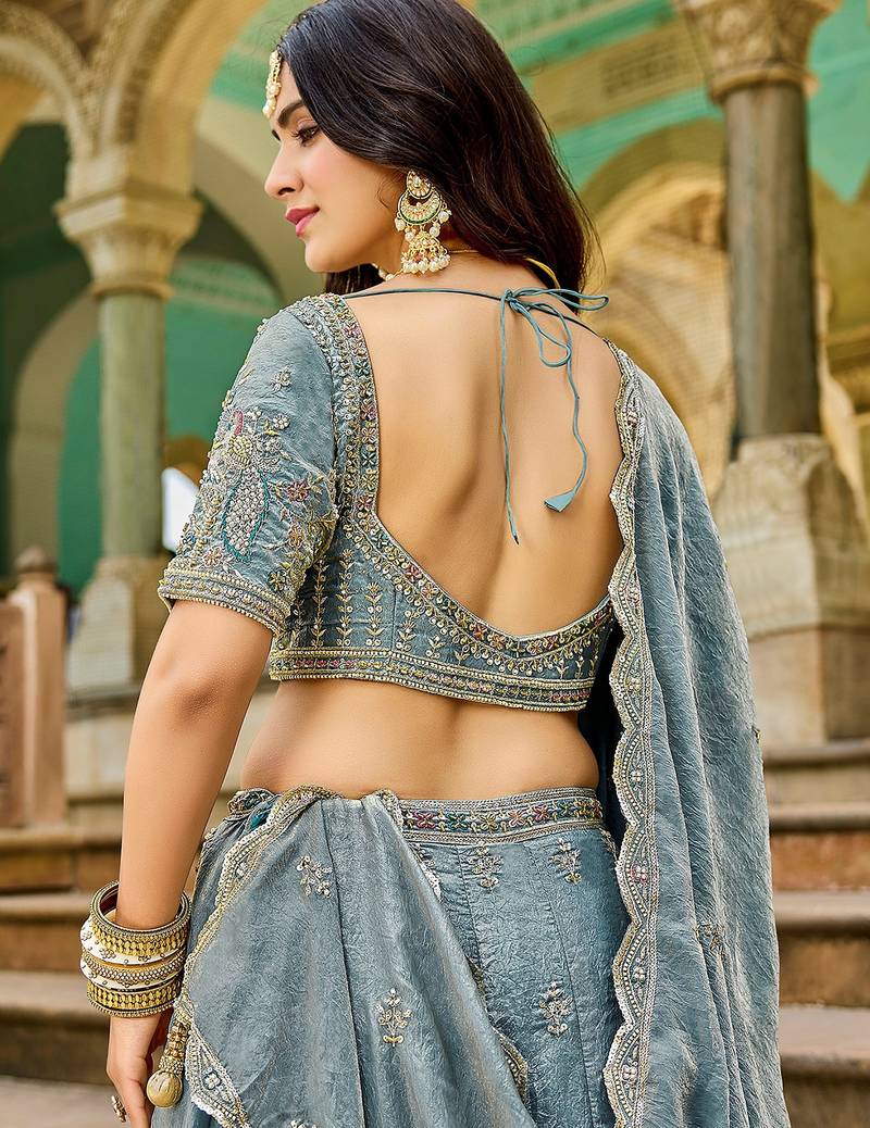 | Product Description | This Elegant Lehenga Comes In A Graceful Muted Blue Grey Tone, Crafted From Rich Gold Crush Fabric That Gives A Soft Sheen And Luxurious Texture. It Is Beautifully Adorned With Intricate Handwork, Mirror Embroidery, And Detailed Beadwork, Creating A Refined Festive Appeal.