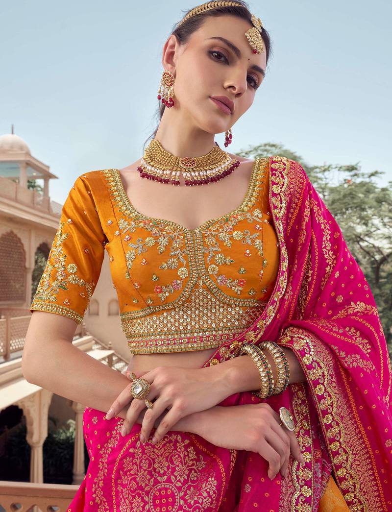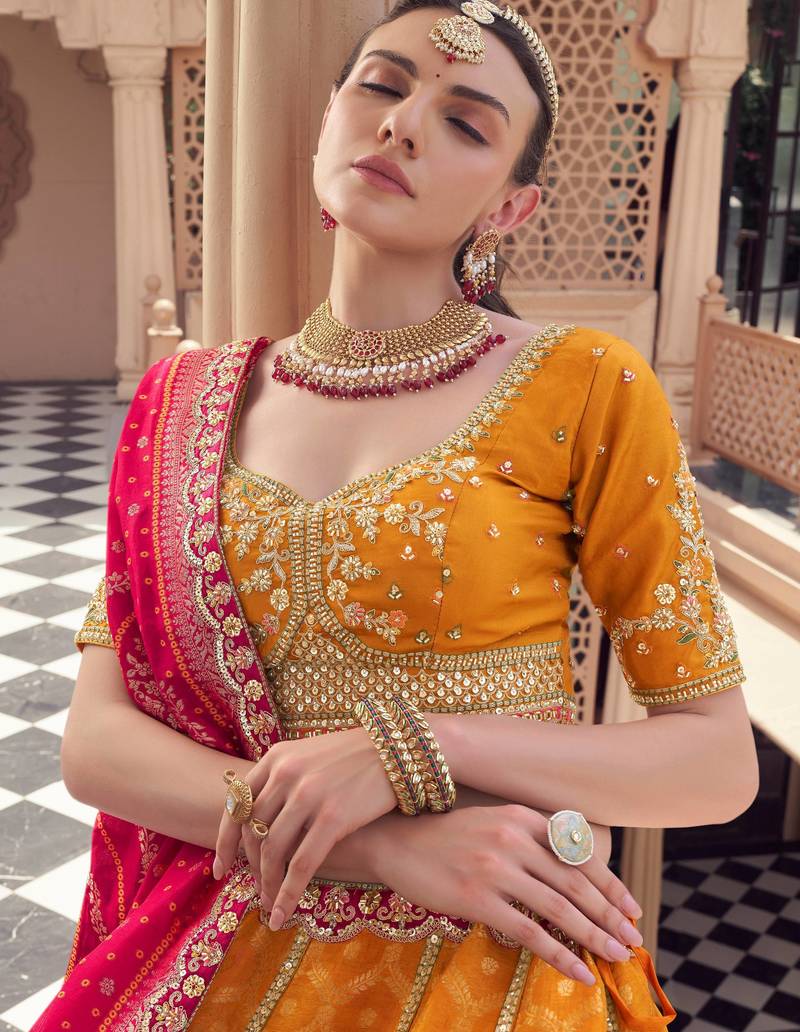 | Product Description | This Lehenga Choli Features A Rich Mustard–Orange Tissue Lehenga Adorned With Intricate Zari Weaving Motifs, Enhanced By Sequins, Bead Work, And Detailed Thread Embroidery. The Broad Hemline Is Beautifully Finished With Traditional Khatli Work And Ornamental Patterns That Add Royal Depth And Festive Elegance To The Overall Look.