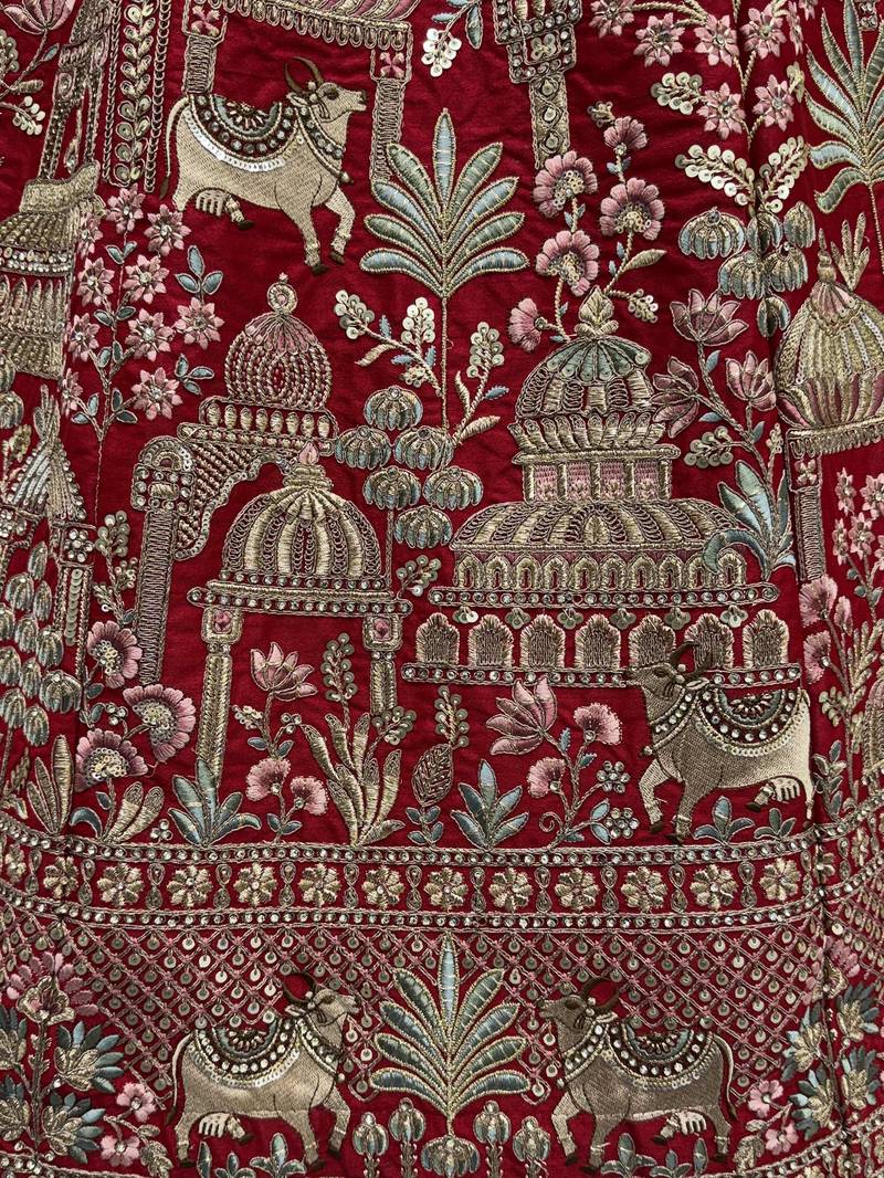 | Product Description | This Luxurious Red Bridal Lehenga Is Crafted In Fine Silk And Adorned With Mesmerising Cotton Multi Thread Motifs. Heavy Dori Work, Zari Embroidery, Sequins, And Zircon Diamonds Elevate The Rich Traditional Craftsmanship.