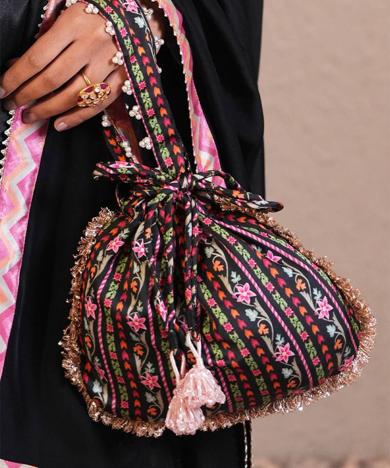 Black silk printed potli bag