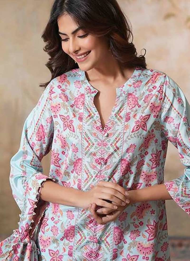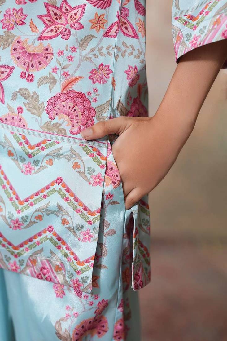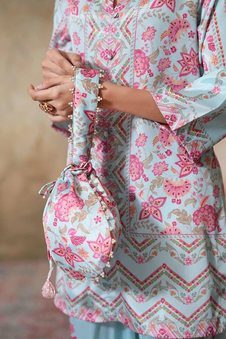 | Product Description | Brighten Up Your Wardrobe With This Vibrant Falak Jaal Coord Set That Blends Traditional Charm With Modern Aesthetics. Featuring A Delicate Chintz Floral Print In Sky Blue, This Set Is Crafted From Premium Crepe Silk For An Effortlessly Breezy And Lightweight Feel.The Top Is Designed With A Relaxed Straight Silhouette With Side Slits And Three Quarter Sleeves Complemented With Potli Buttons In The Front.