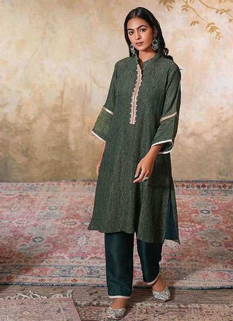 | Product Description | Indulge In Elegance With This Vibrant Bagh Tissue Silk Set, Featuring An A Line Kurta In Emerald Green Crushed Tissue Silk Fabric Paired Flawlessly With Emerald Green Chanderi Narrow Pants. The Kurta, With A Sophisticated Collared Neckline, Is Elevated By Intricate Pearl And Gota Embellishments, While Its Full Sleeve Hem Has A Stripe Tissue Chanderi Piping And Gota Embellishments.