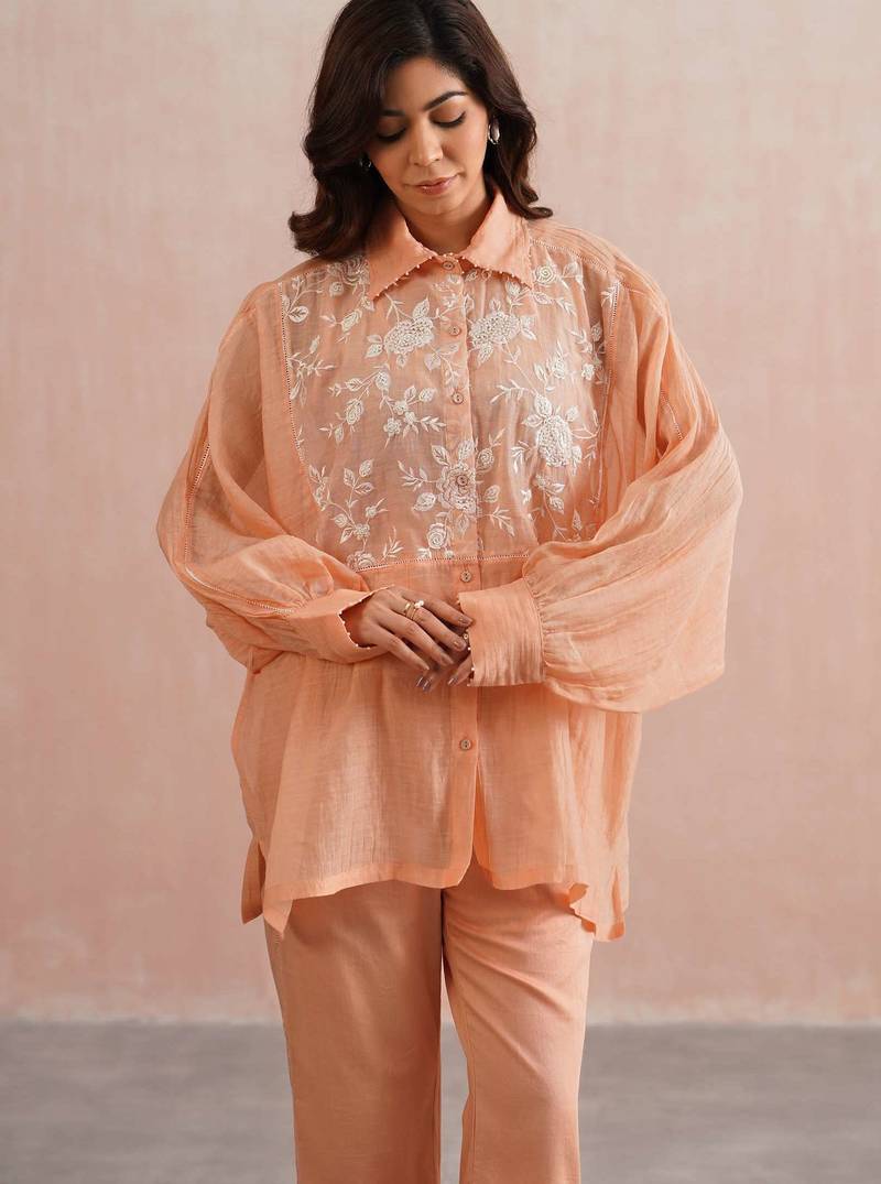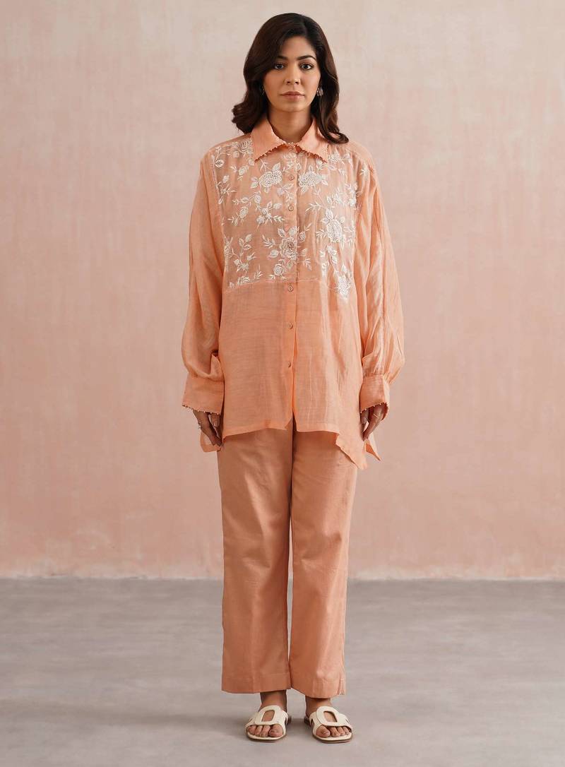 Peach embroidered chanderi co ord set