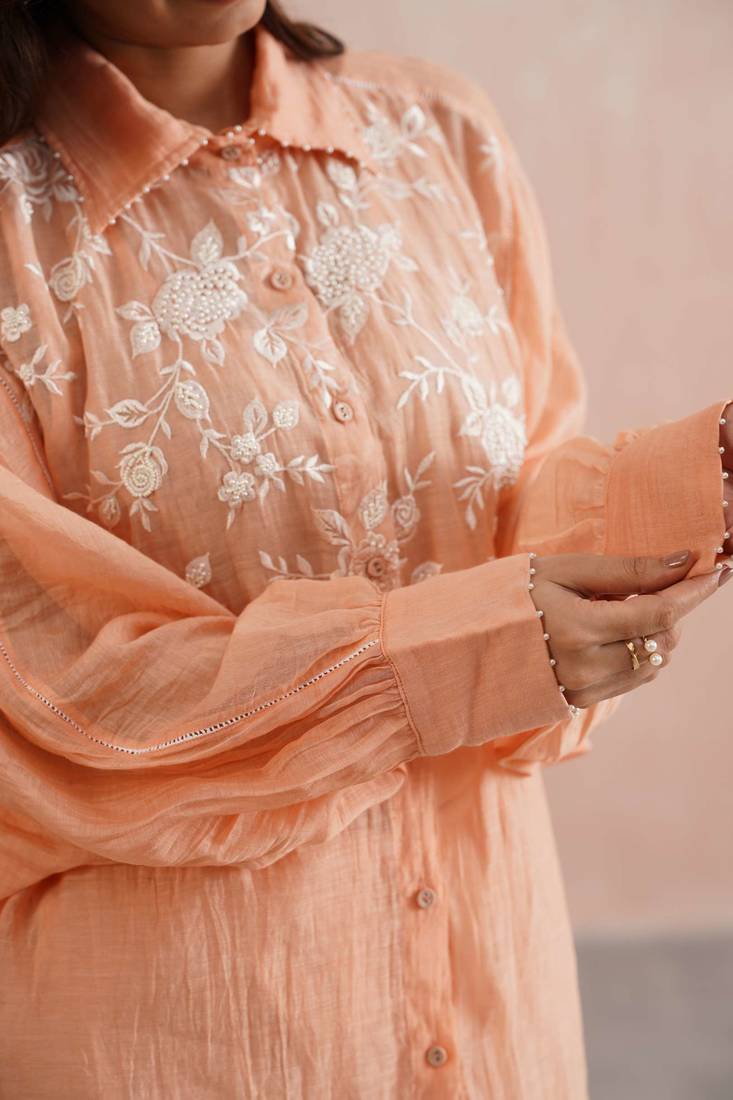 | Product Description | Elegant And Thoughtfully Detailed, The Aurelia Set Comes In A Soft Peach Tone With A Relaxed Kimono Style Shirt. The Front Yoke Is Detailed With Delicate White Lace And Hand Embroidered Roses, Finished With Pearl Embellishments. Pearls Also Accent The Collar And Cuffs, Adding Refined Charm.