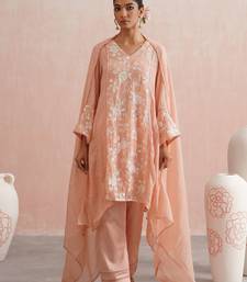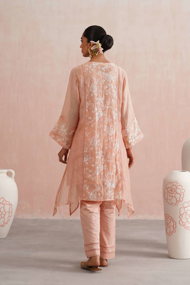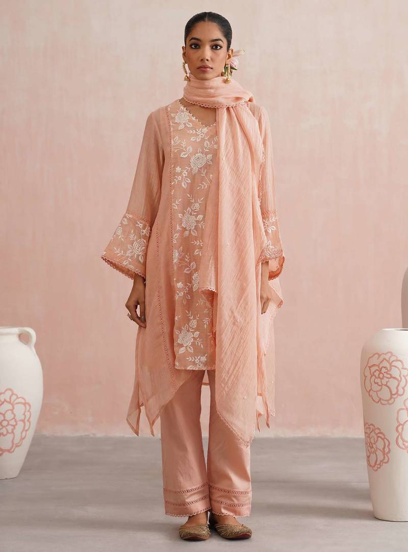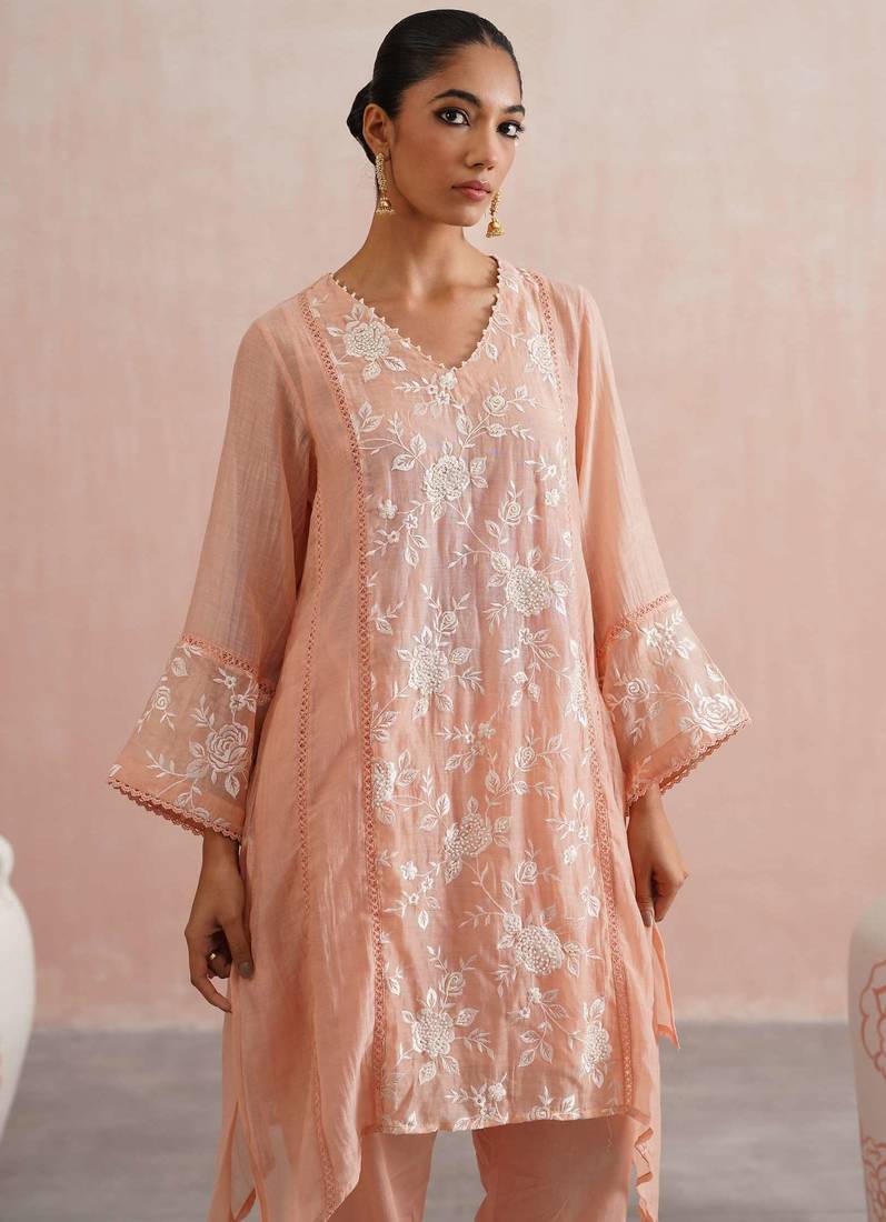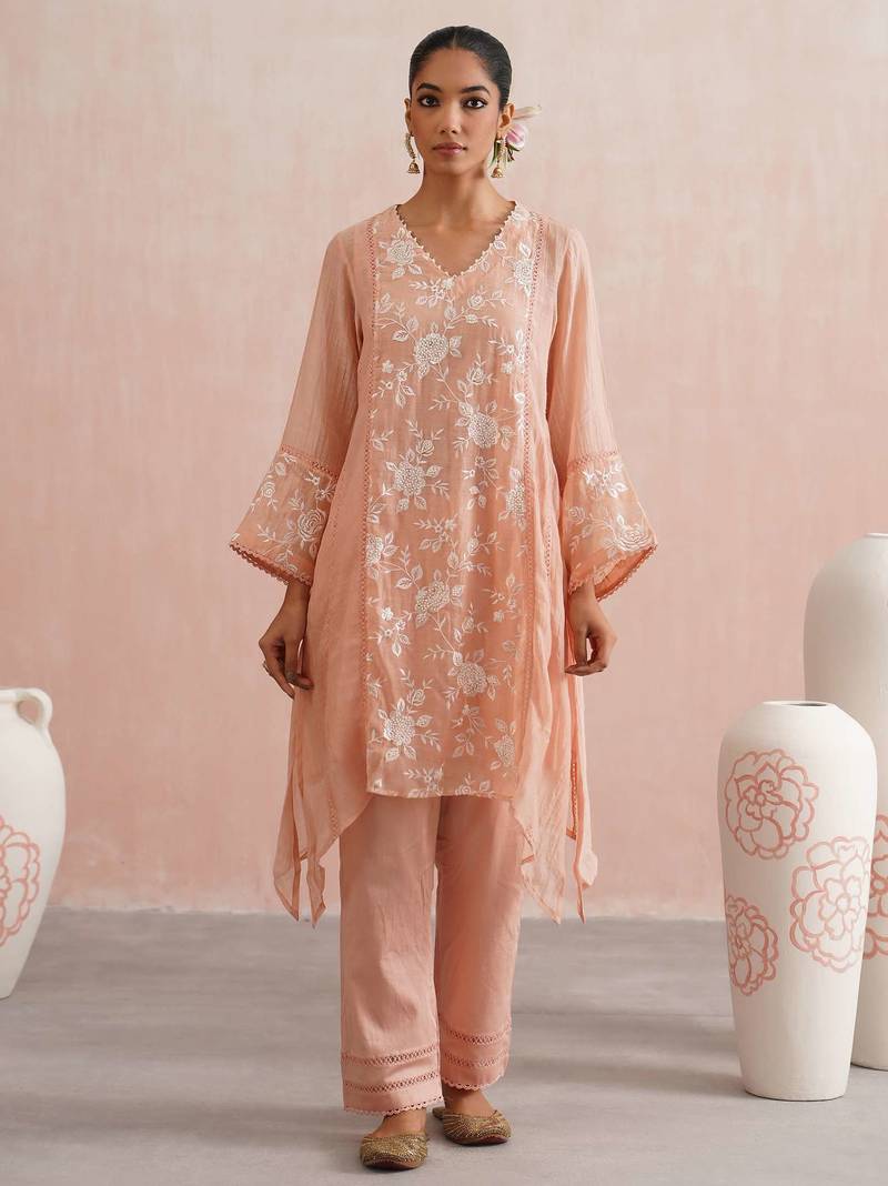 | Product Description | Delicate And Dreamy, The Peony Set Is Perfect For Festive Days, Family Gatherings, And Elegant Occasions.Crafted In Peach Mul Chanderi, The A Line Kurta Features Longer Sides With Soft Slits And Is Beautifully Embroidered With White Roses On The Front, Back Panel, And Sleeves,Enhanced With Pearl Embellishments. A Pearl Detailed V Neckline, Lace Paneling, And Intricate Detailing On The Sleeves And Sides Add Charm To The Silhouette.