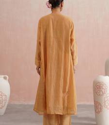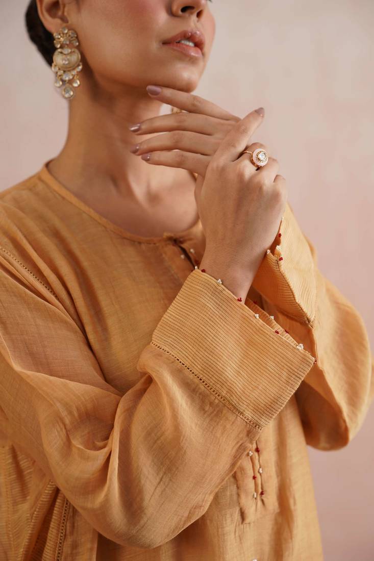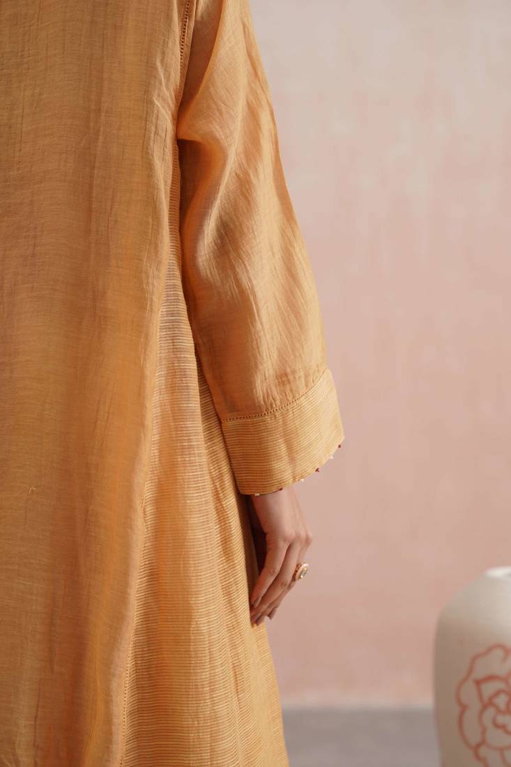 | Product Description | The Inaya Set Is A Beautiful Blend Of Tradition And Vibrance, Crafted In Pure Mul Chanderi Fabric In A Warm Apricot Peach Tone. Designed In A Flowing Kalidar Silhouette With Full Sleeves And Chanderi Stripe Panels, It Features A Front Button Neckline Embroidered With Pearls And Pink Beads, Finished With Delicate Jewel Hangings.