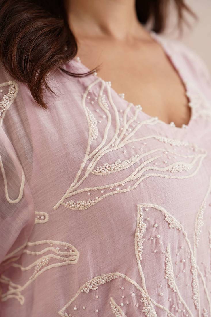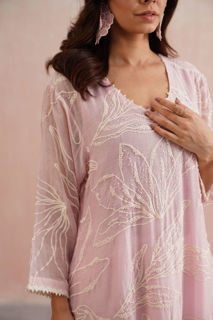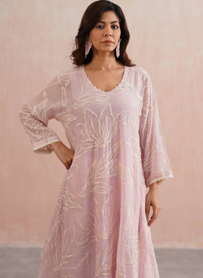 | Product Description | The Liliana Set Is Crafted In A Soft Rose Pink Mul Chanderi And Adorned With Abstract Embroidery Beautifully Handcrafted With Delicate Pearl Embellishments Across The Kurta. An A Line Silhouette Designed With Functional Pockets And A Pearl Detailed V Neckline, It Blends Charm With Comfort.