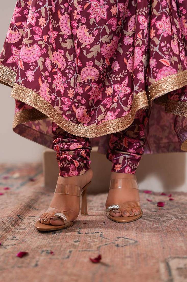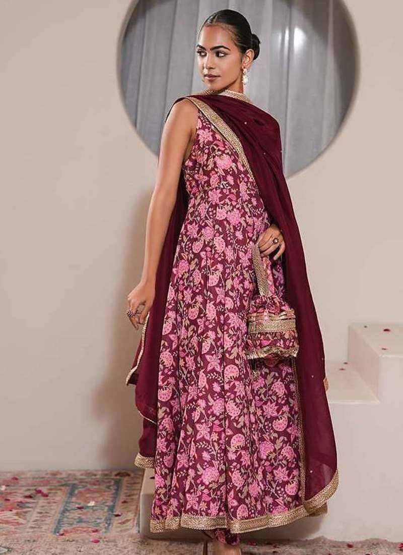 | Product Description | Step Into Timeless Grace With This Sangria Pink Chintz Printed Crepe Silk Petunia Gul Anarkali Set, Perfect For Making An Elegant Statement. The Halter Neck Kurta With A Back Opening Features Delicate Floral Embroidery That Spreads Across The Bodice And Flares Gracefully, Accentuating Its Flowing Silhouette. The Hem Is Adorned With Gota Embelishments, Adding A Hint Of Sophistication.