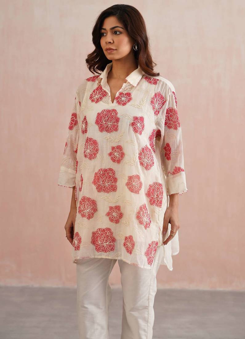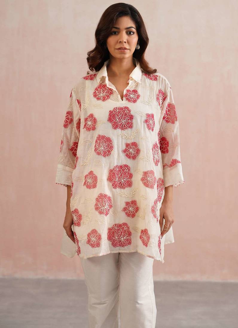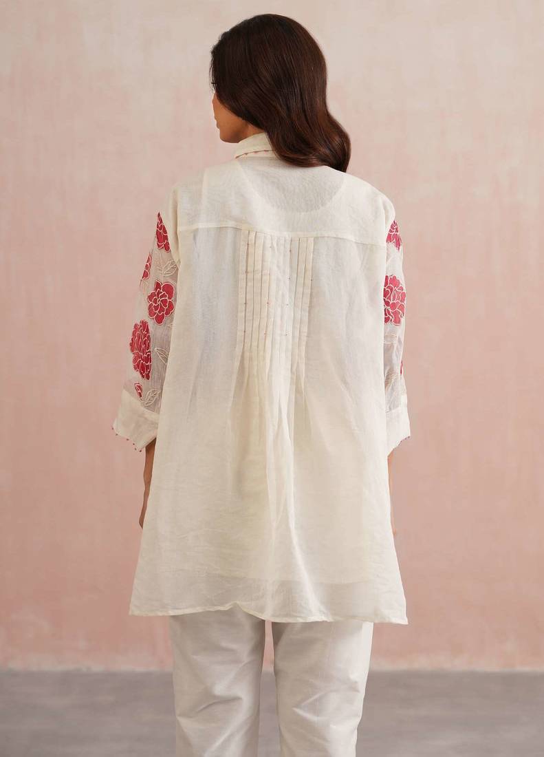 | Product Description | A Vibrant Blend Of Comfort And Craft, The Scarlet Set Features A Free Size, Oversized Shirt In Ivory Mul Chanderi, Adorned With Striking Red Floral Appliqué Embroidery. Each Bloom Is Meticulously Handcrafted With Delicate Pearl Detailing, While Red Bead Accents Along The Collar And Sleeve Cuffs Echo The Floral Hue.