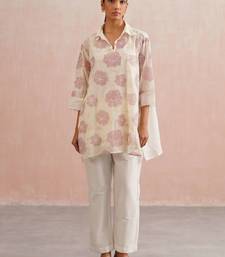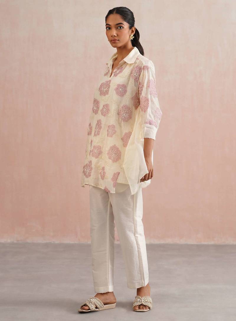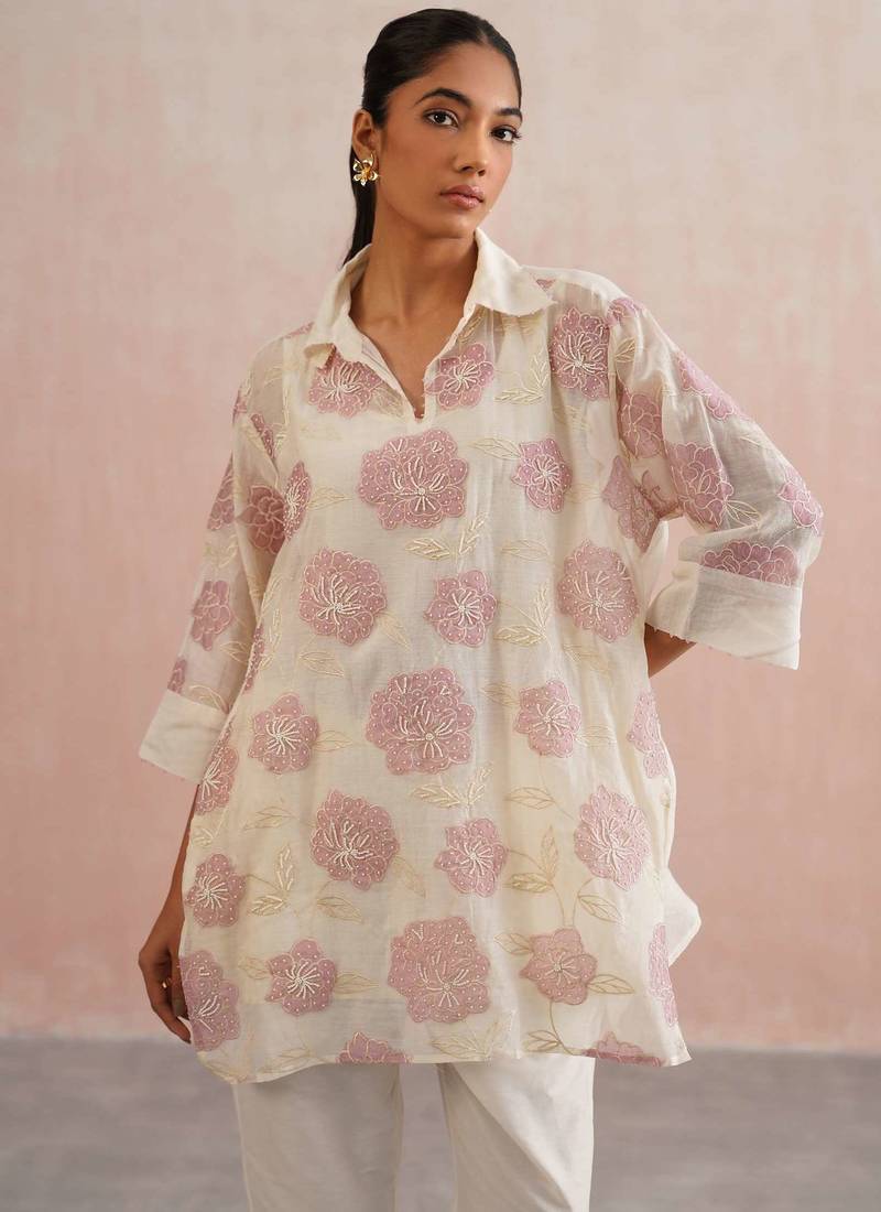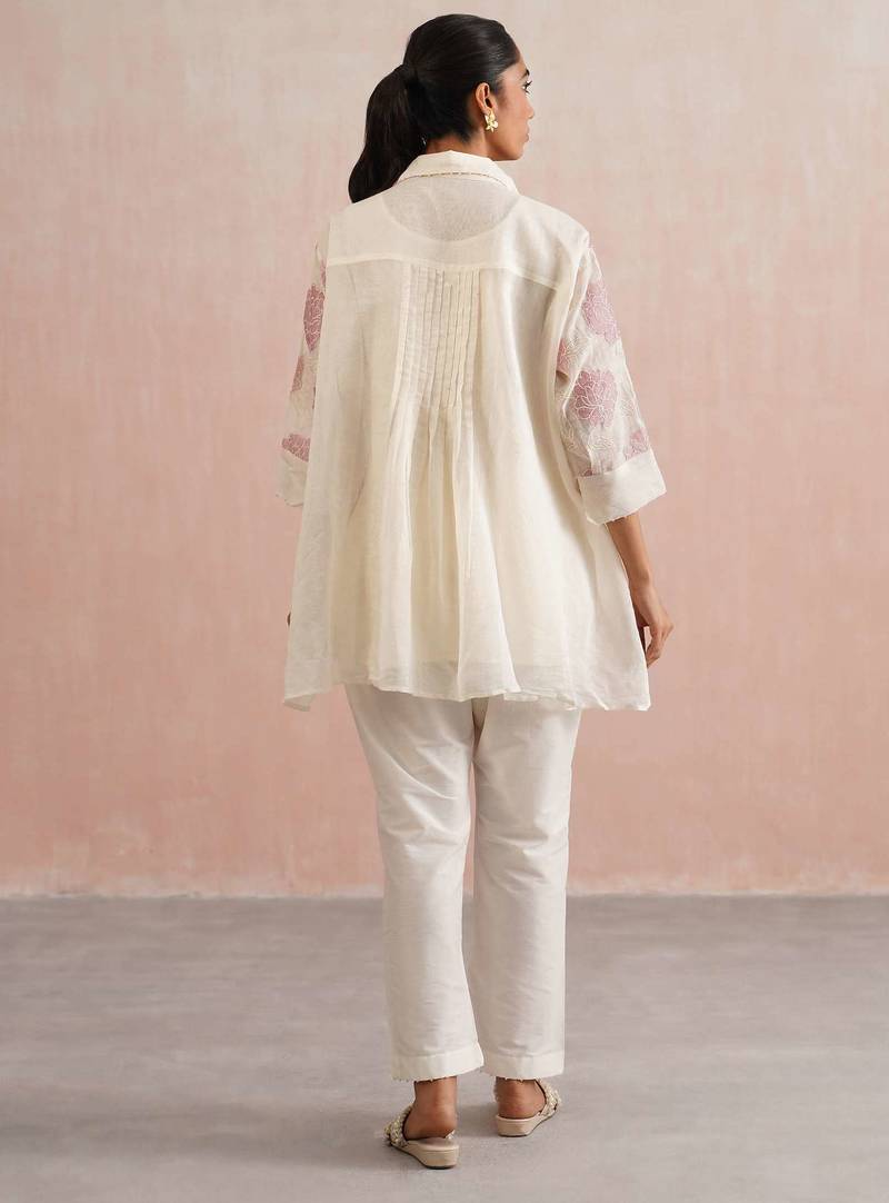 | Product Description | A Vibrant Blend Of Comfort And Craft, The Iris Set Features A Free Size, Oversized Shirt In Ivory Mul Chanderi, Adorned With Subtle Lilac Floral Appliqué Embroidery. Each Bloom Is Meticulously Handcrafted With Delicate Pearl Detailing, While Lilac Bead Accents Along The Collar And Sleeve Cuffs Echo The Floral Hue.