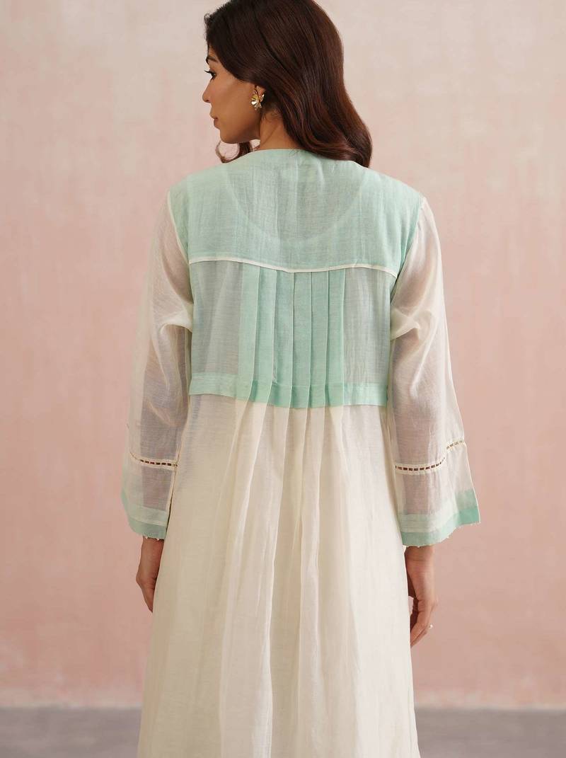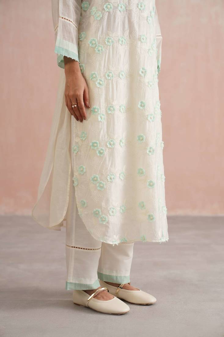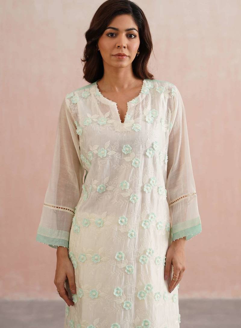 | Product Description | Ethereal, Refined, And Refreshingly Elegant The Clara Set Is Crafted In Serene Ivory Mul Chanderi, Featuring Delicate 3 D Mint Green Floral Embroidery With Intricate Pearl Accents On Each Bloom. The Full Length Sleeves Are Finished With Lace Inserts And Mint Green Borders, Mirroring The Embroidery’s Subtle Charm.