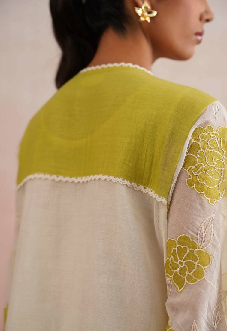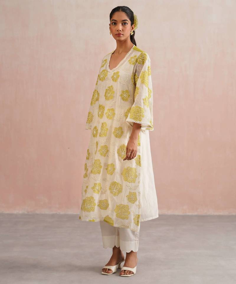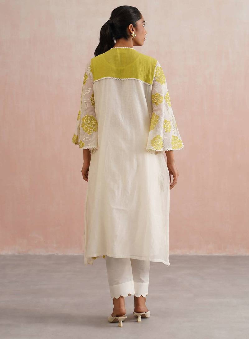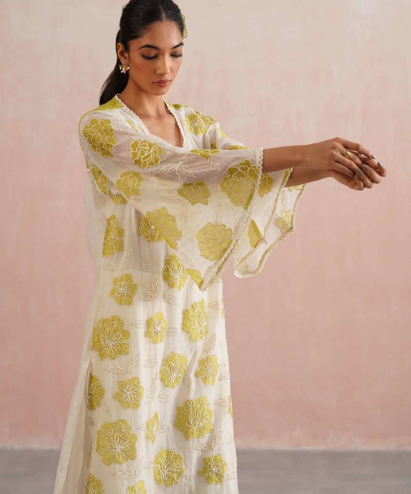| Product Description | The Zinnia Set Is A Soft, Graceful Choice For Festive Occasions Like Rakhi, Diwali Brunches, Or Intimate Gatherings.Made In Pure Mul Chanderi Fabric, The Kurta Features Lime Green Floral Appliqué Embroidery With Pearl Embellishments And A Delicate Lace Trimmed V Neckline. The Full Length Umbrella Sleeves And A Matching Blue Back Yoke With Lace Adds Elegance And Ease. It Has A Straight Fit With Slits.