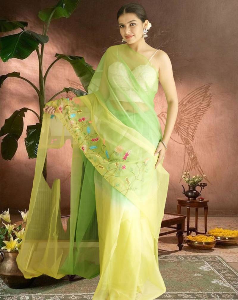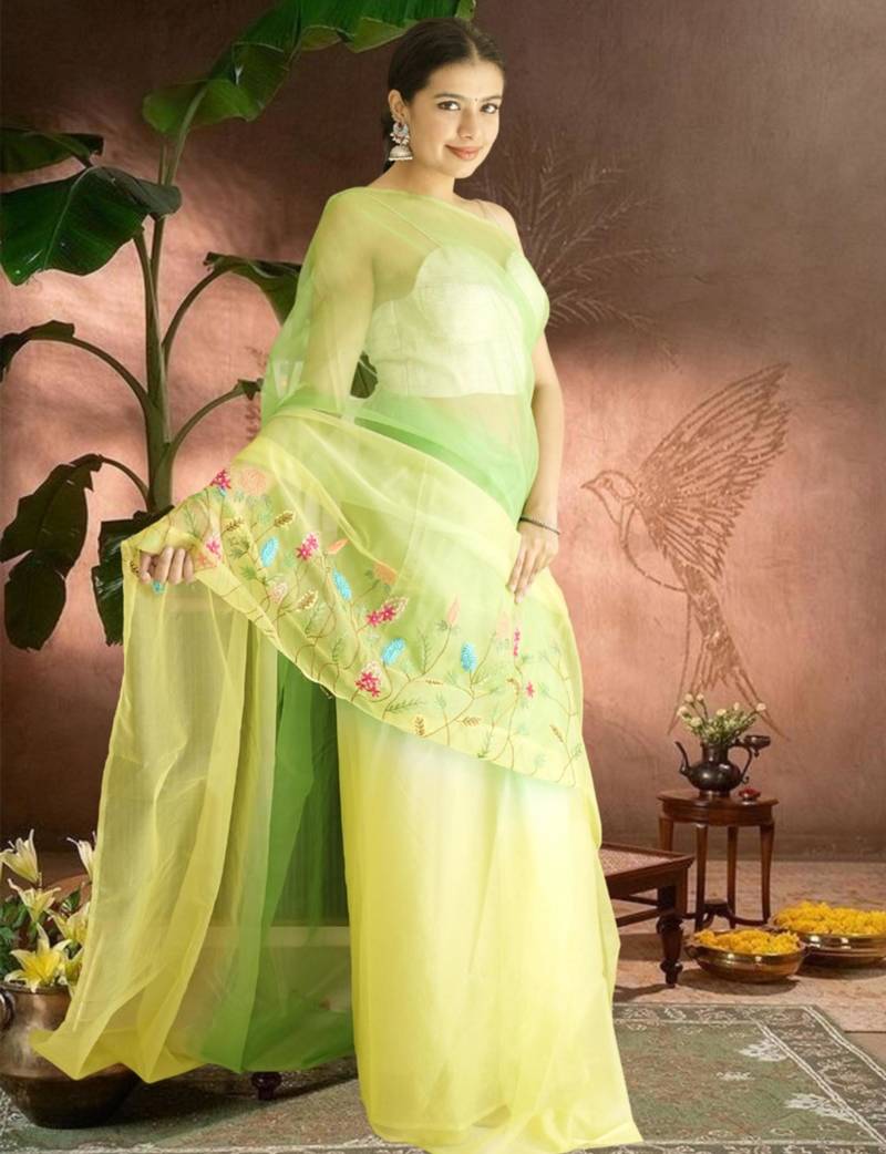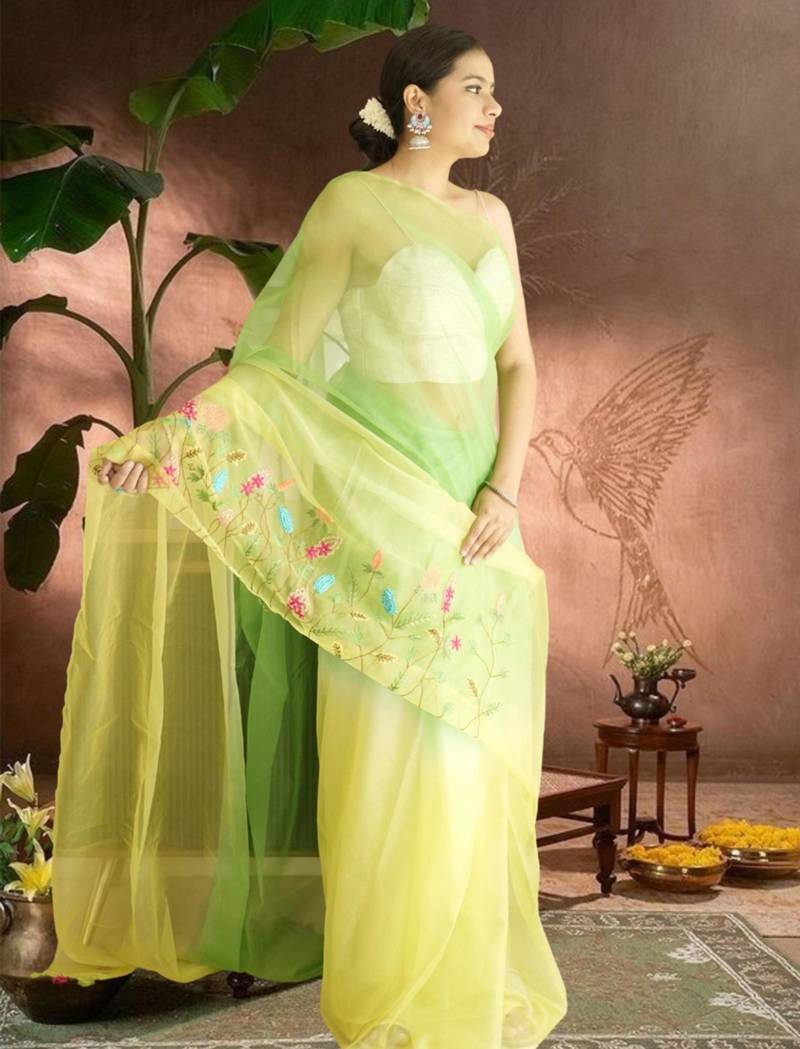 | Product Name | Green Lime Green Ombre Organza Saree With Hand Embroidery | |