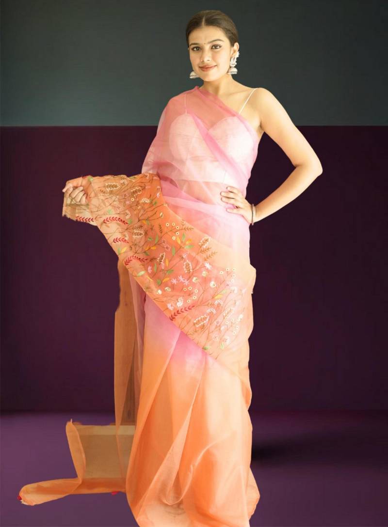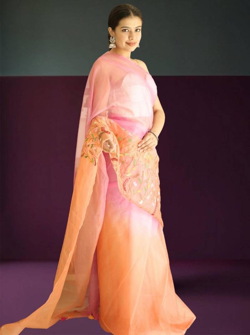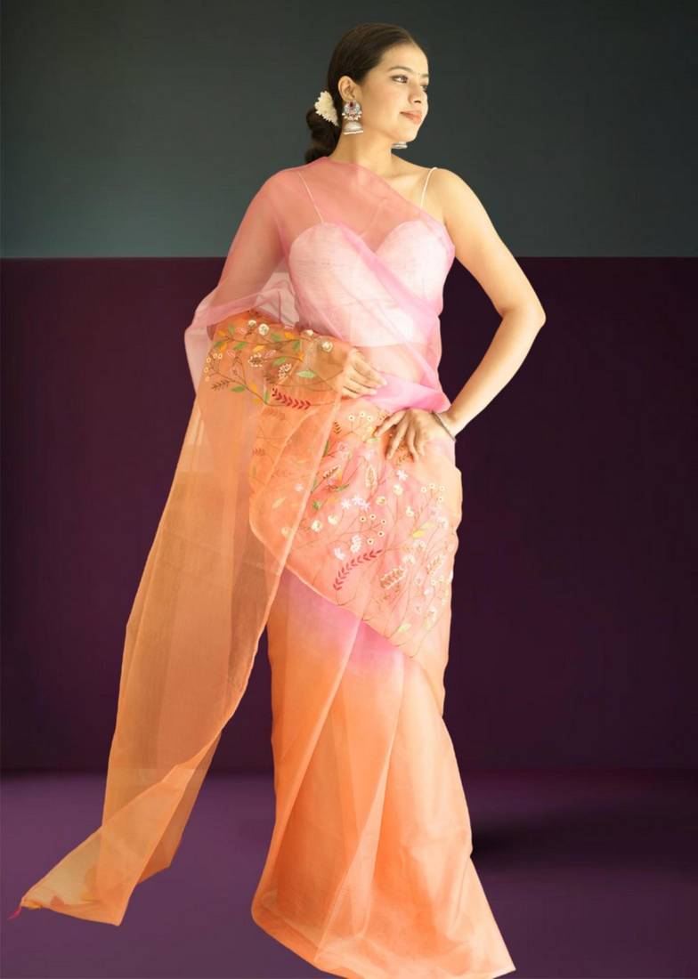 | Product Name | Orange Pink Ombre Organza Saree With Hand Embroidery | |