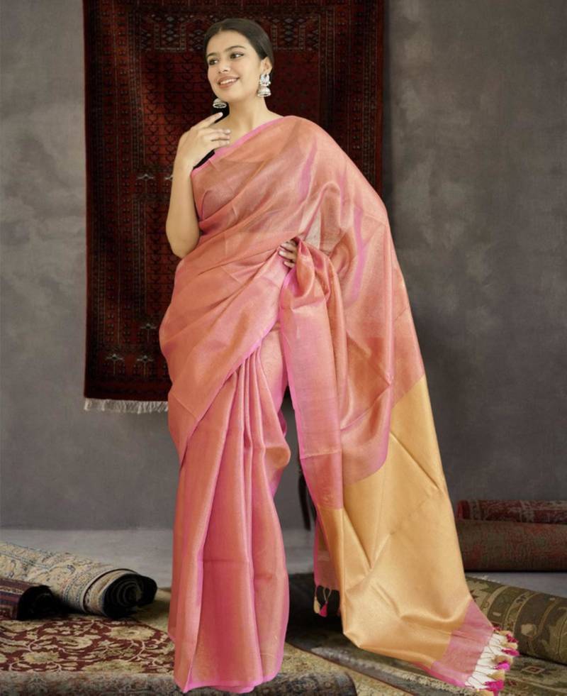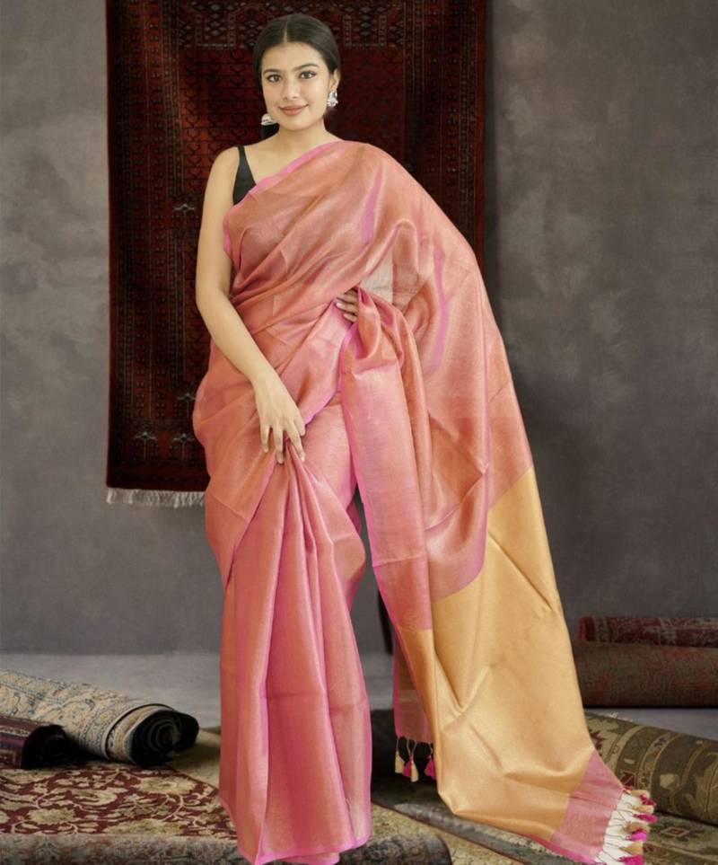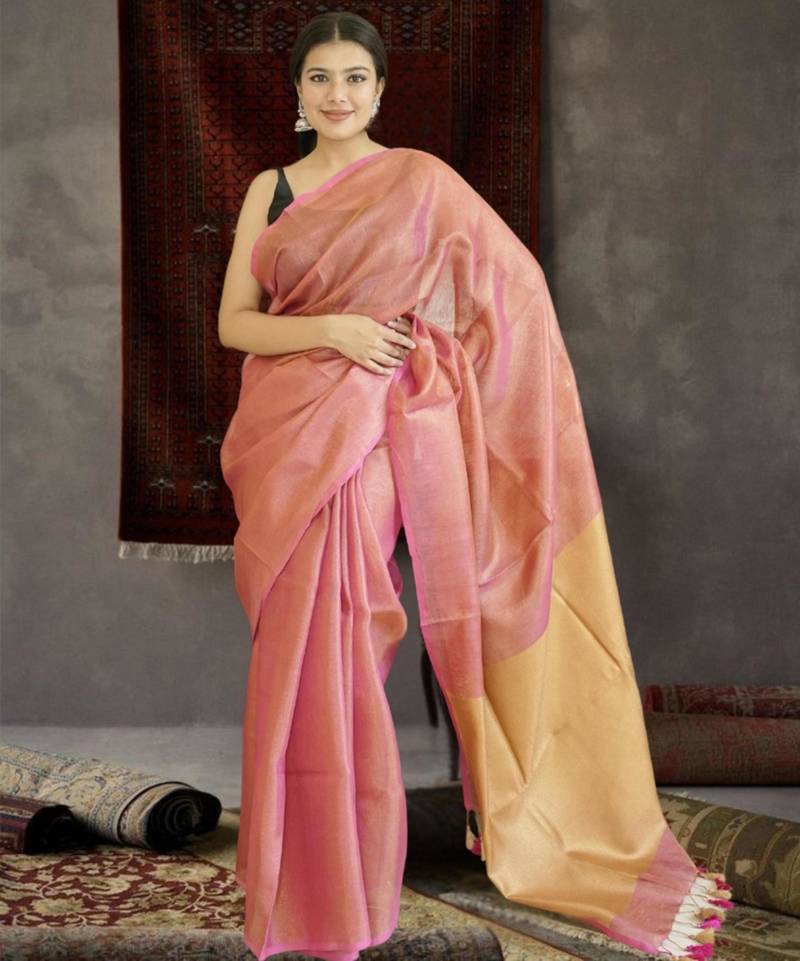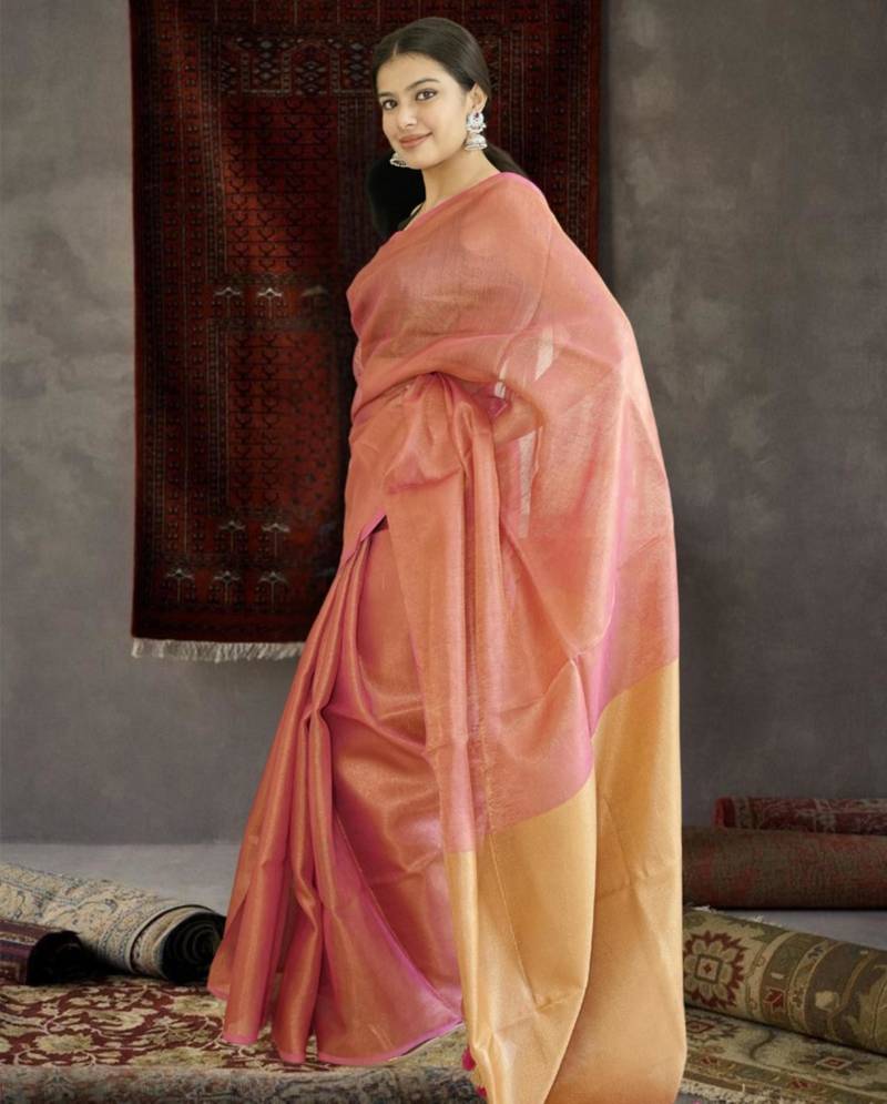 | Product Name | Orange Tissue Linen Saree With Golden Zari Pallu | |