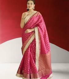 Red-gold banarasi silk blend saree with lace border