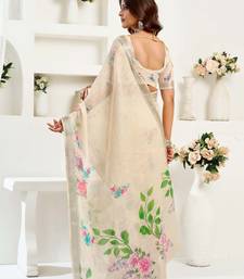 Light beige printed linen one minute saree with unstitched blouse designer traditional ready to wear saree