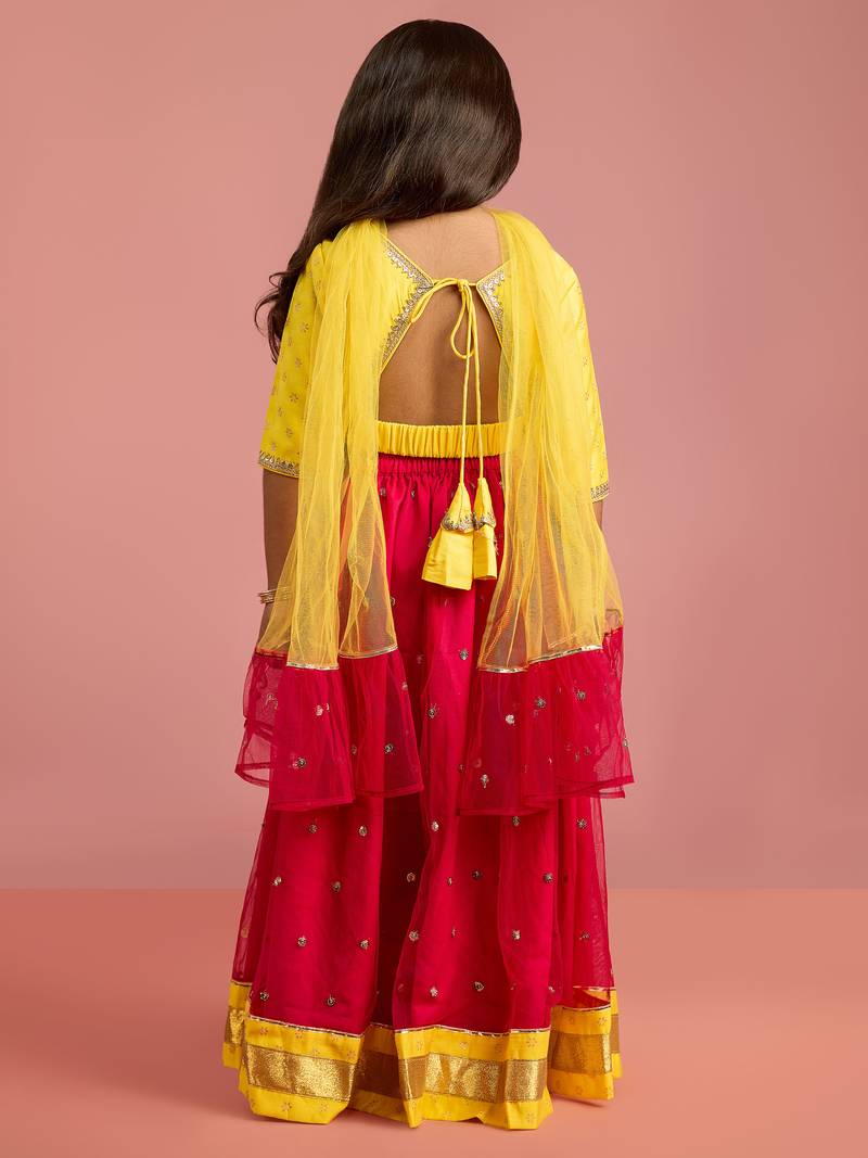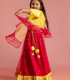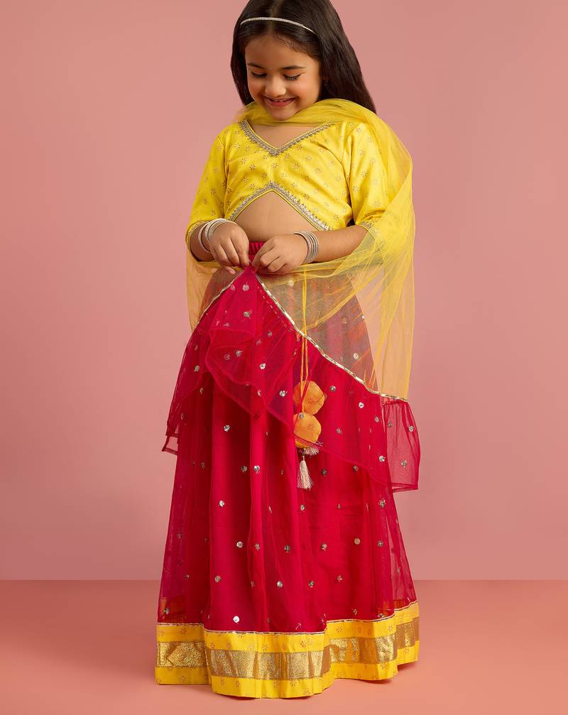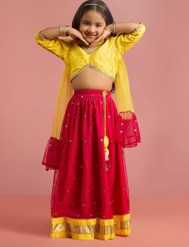 | Product Name | Girls Net Fabric Floral Foil Print Cropped Top With Flared Lehenga Ethnic Set | |