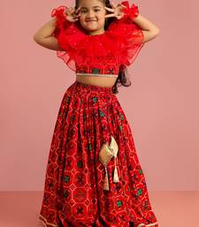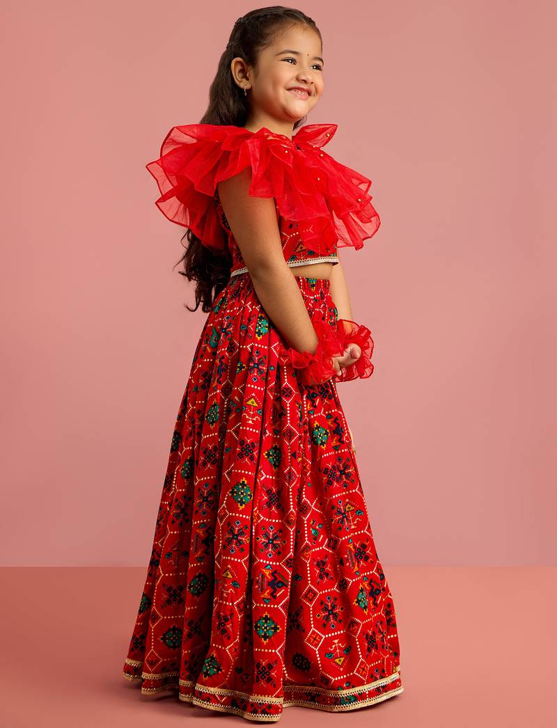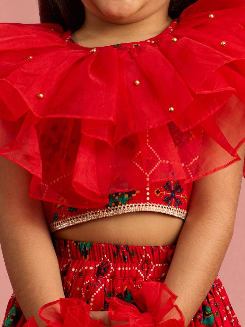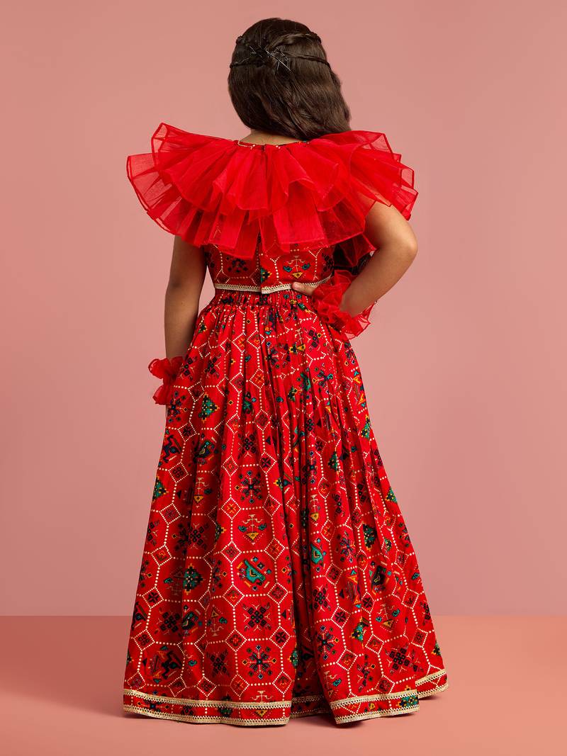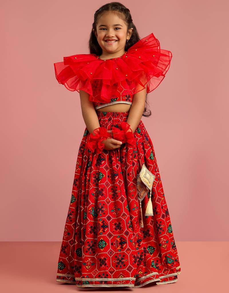 Red patola print rayon lehenga choli set with accessories & ruffled hand gloves