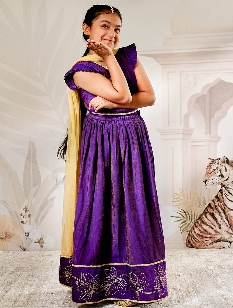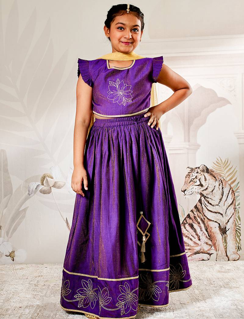 Vastramay girls traditional purple silk lehenga set with thread embroidery and gold dupatta for wedding party wear